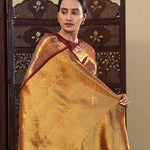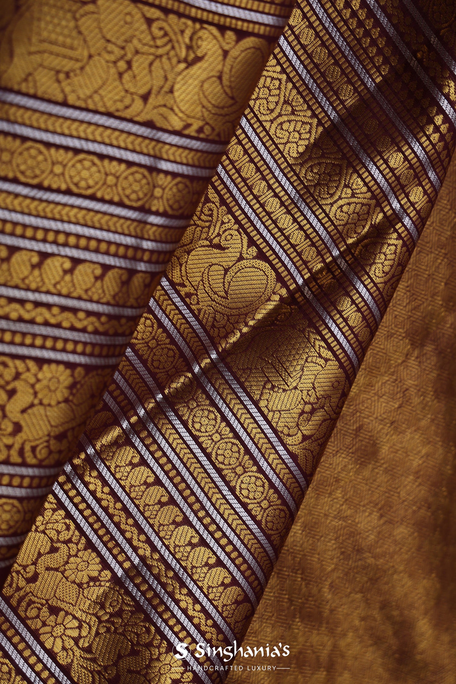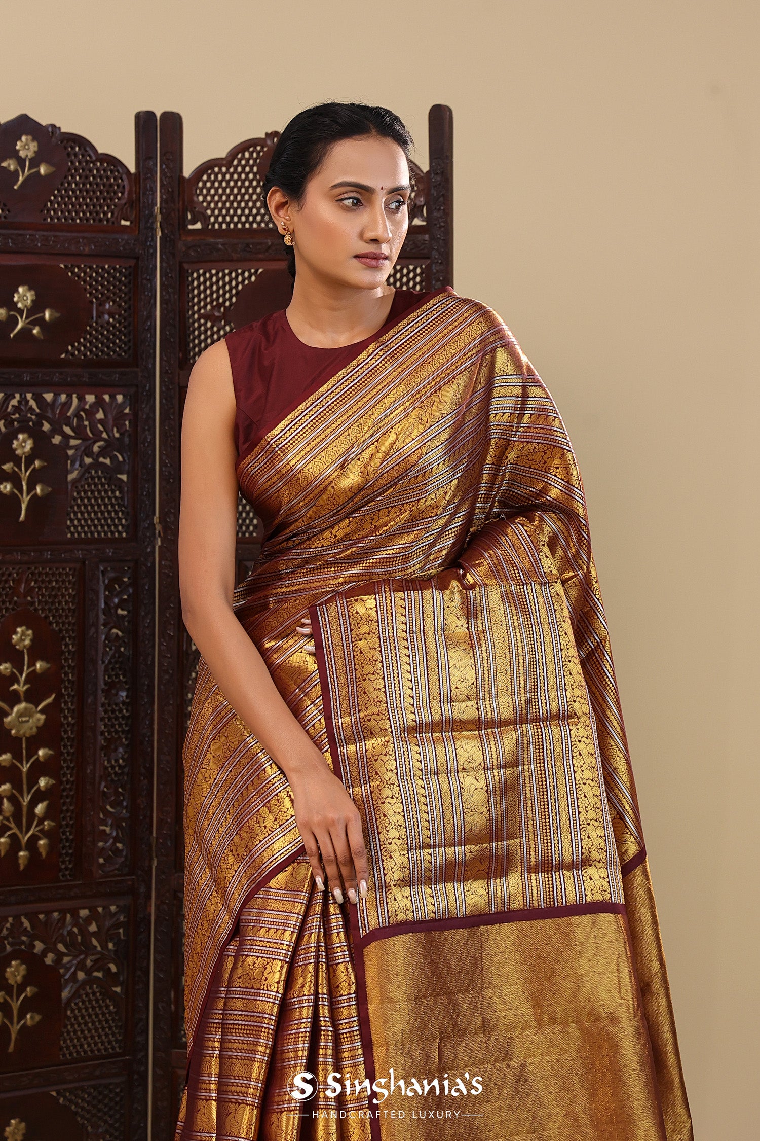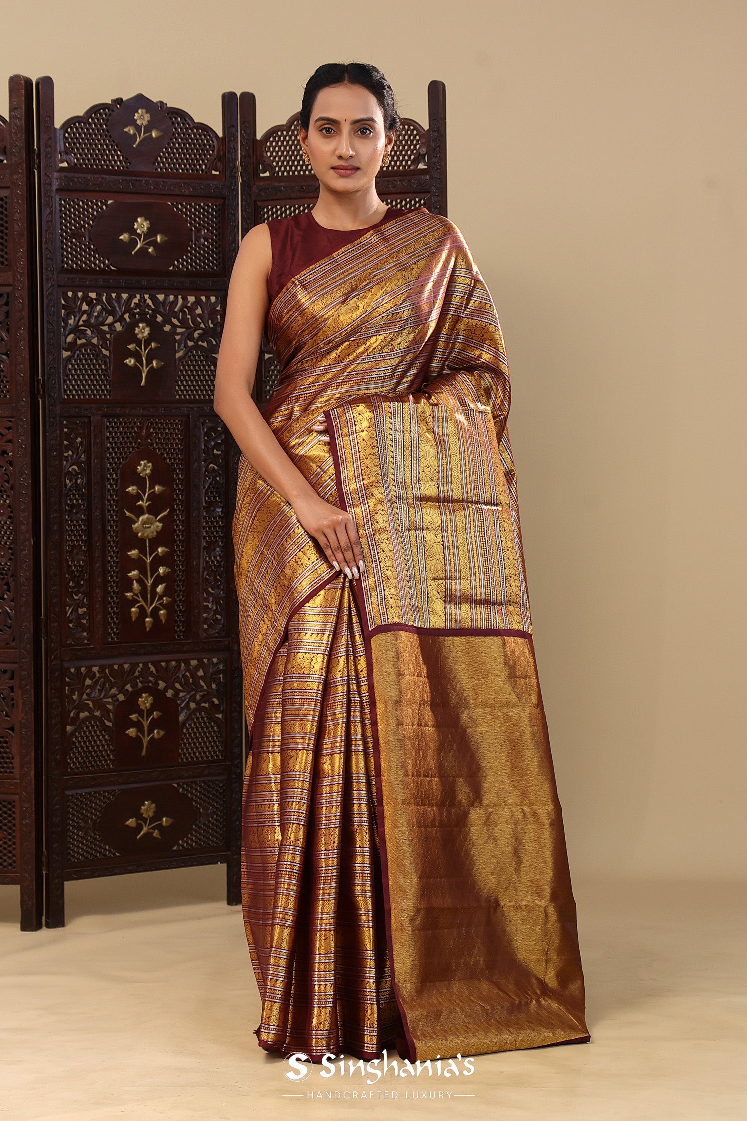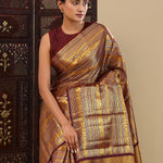 Very Dark Maroon Kanjivaram Silk Saree With Horizontal Stripes