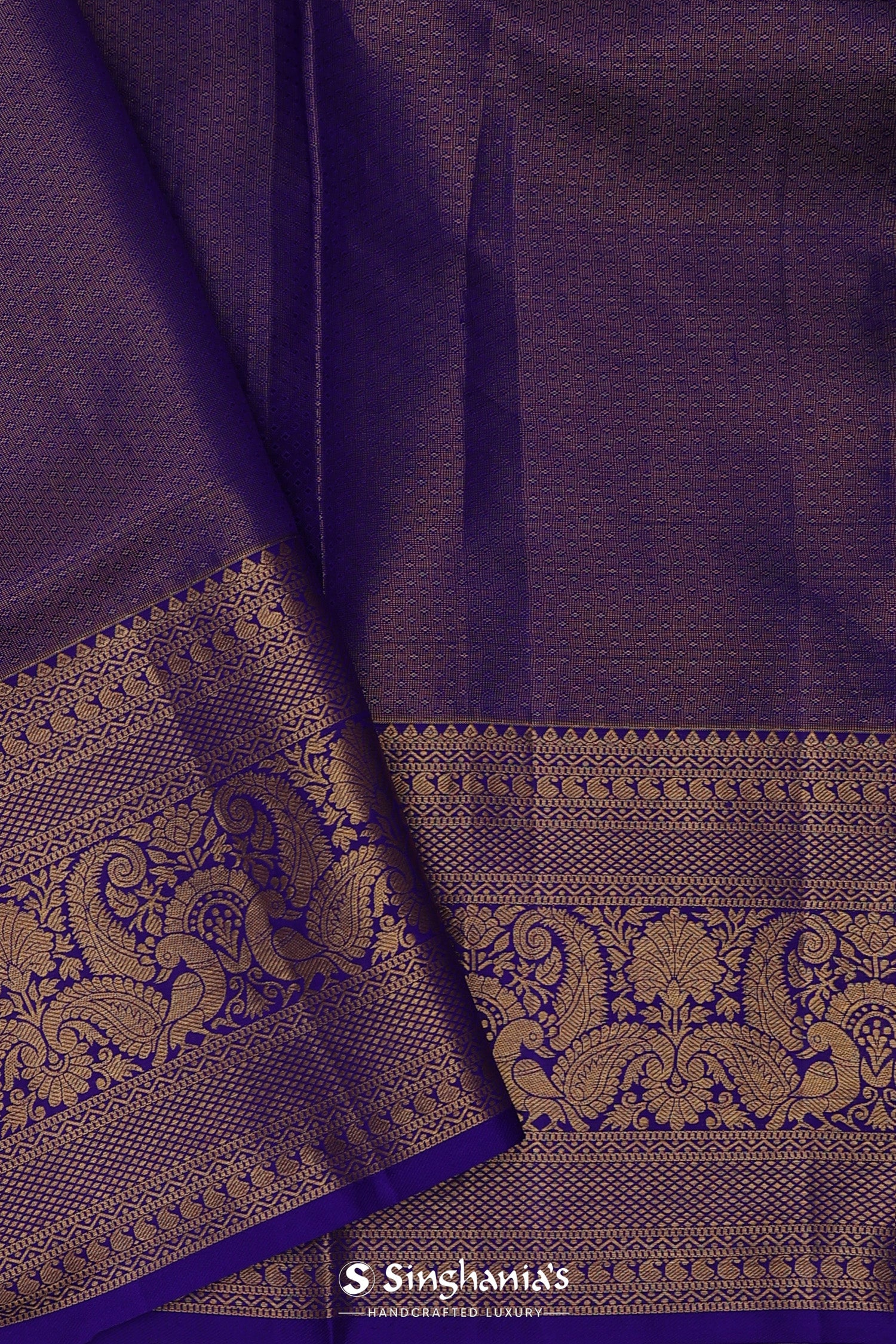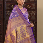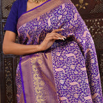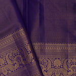 This peacock and leaf jaal woven with gold zari spread across the body of Violet kanjivaram silk saree complemented with self border