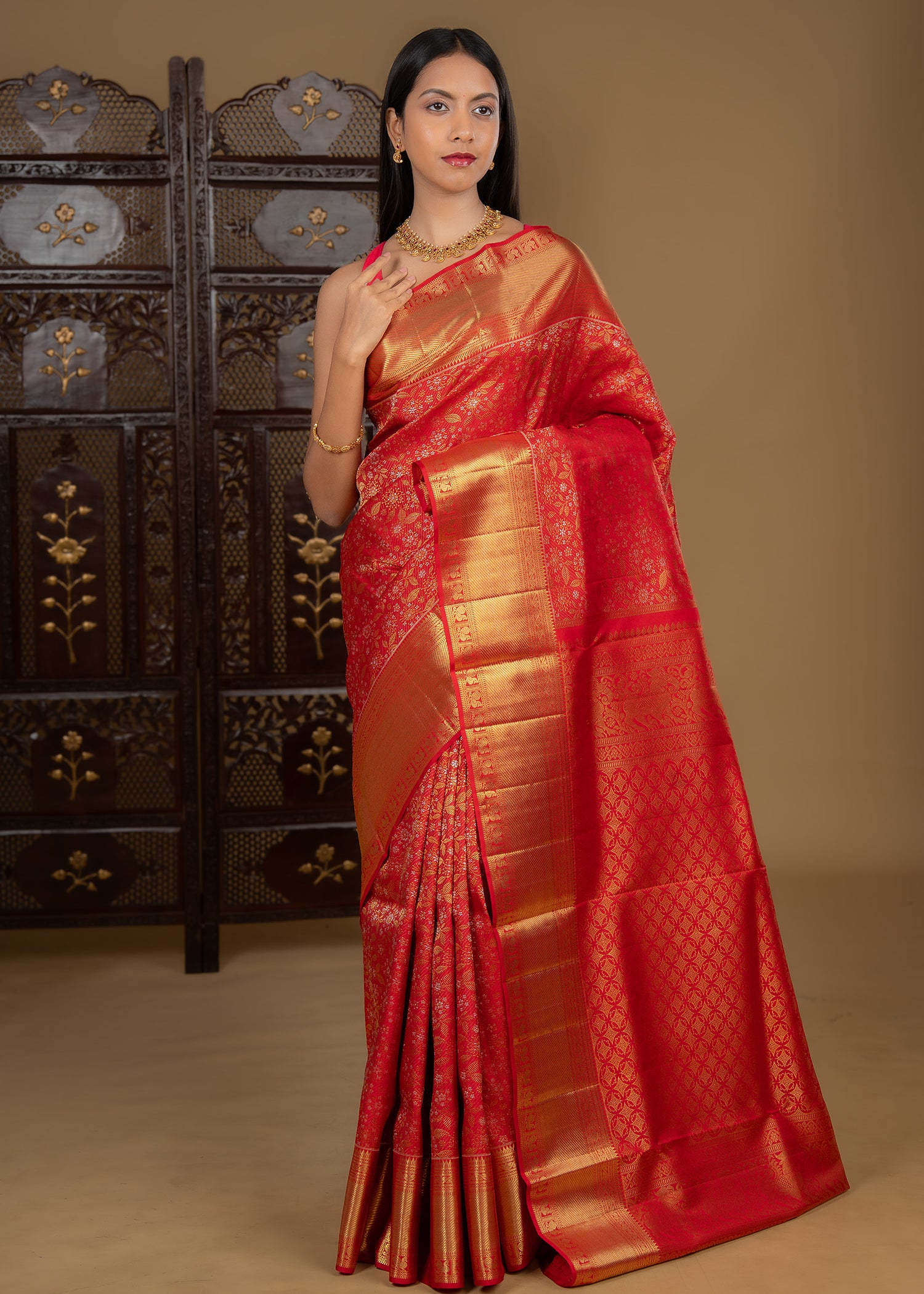 Persian Red Kanjivaram Silk Saree With Floral-Fauna Weaving
