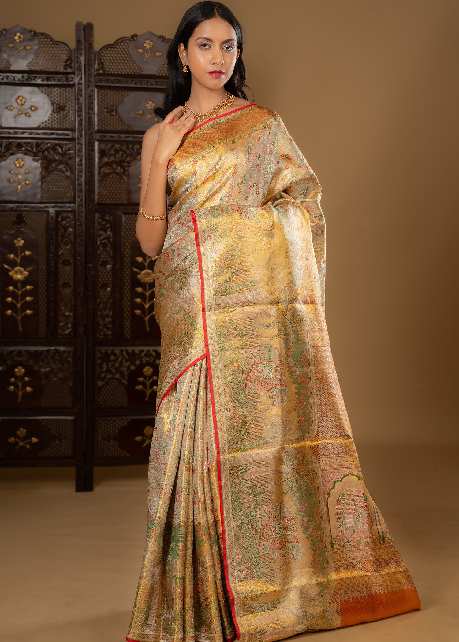 Golden Floral Meenakari Kanjivaram Silk Saree