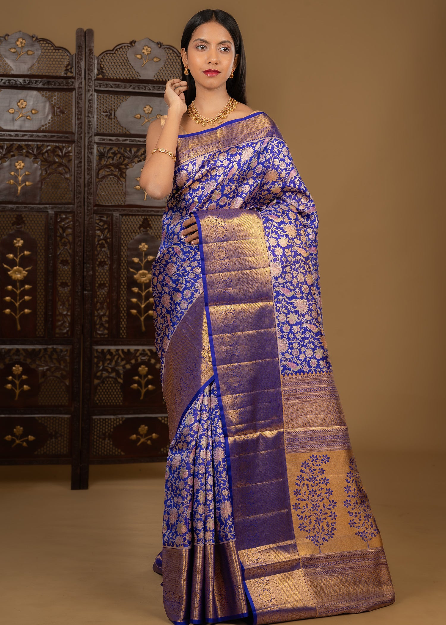 Purple-Gold Kanjivaram Saree with Floral Jaal Weave