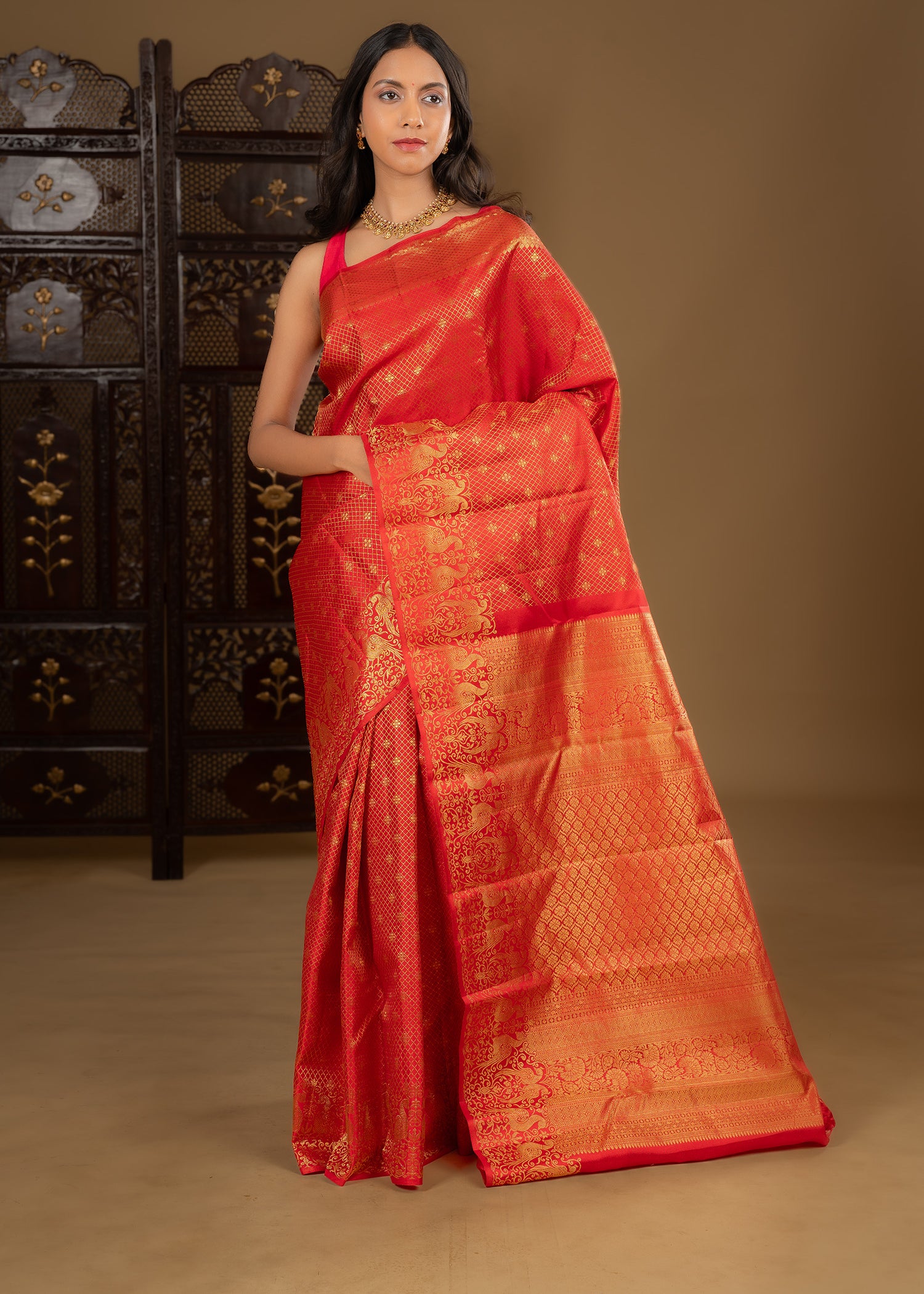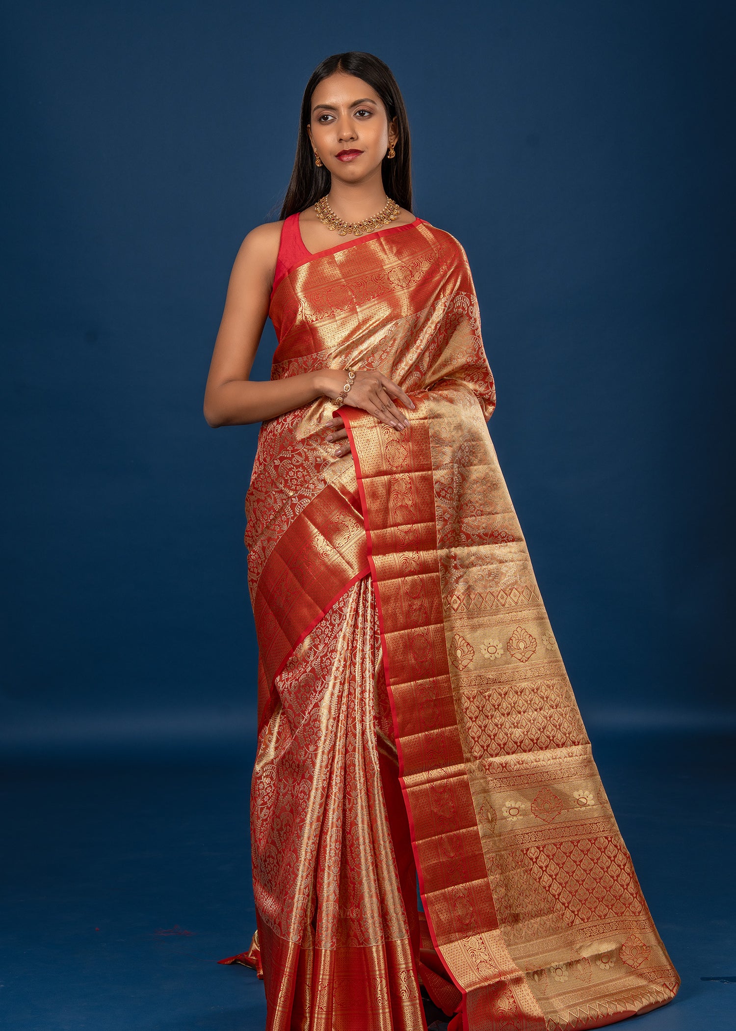 Golden Red Zari Woven Kanjivaram Silk Saree
