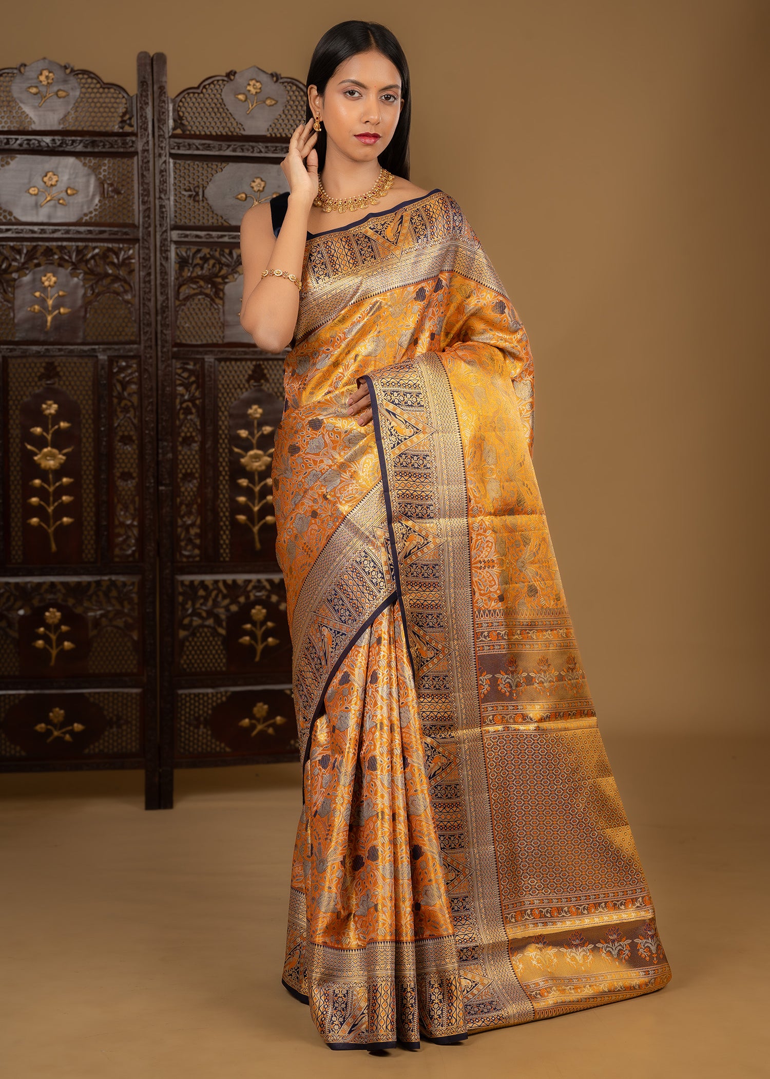 Golden Orange Floral Kanjivaram Silk Saree