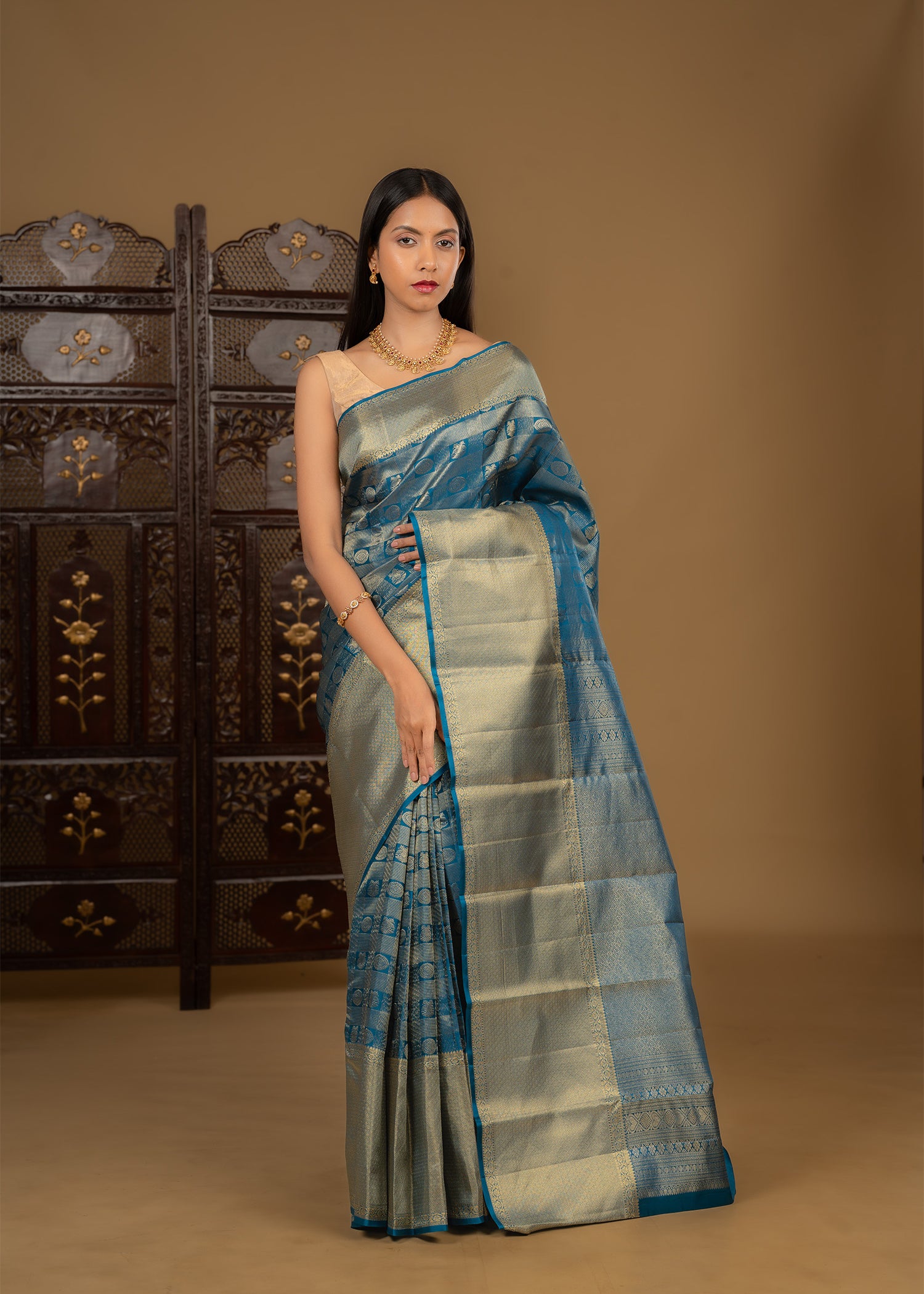 Dark Cyan Blue Floral Kanjivaram Silk Saree