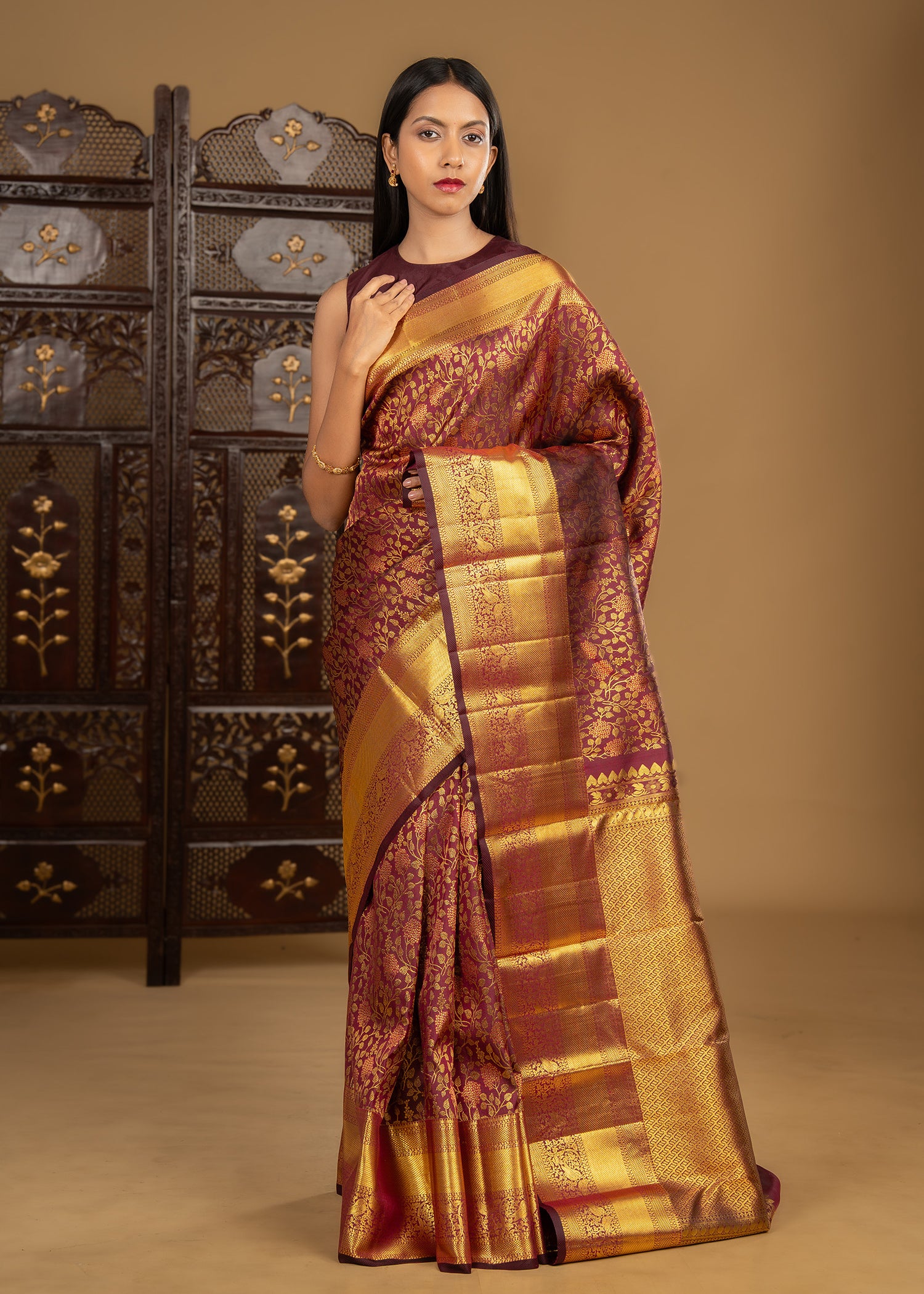 Dark Burgundy Floral Kanjivaram Silk Saree