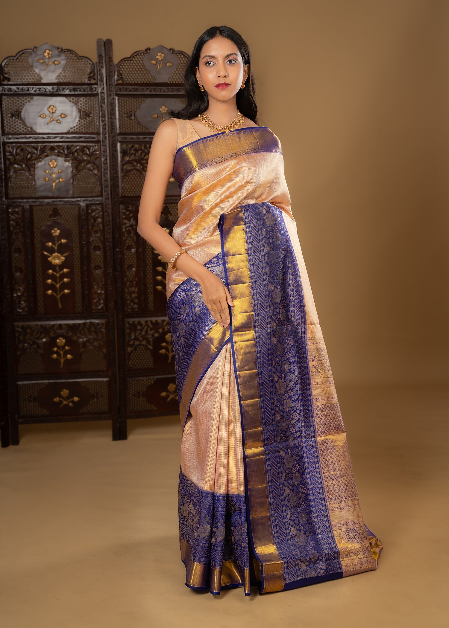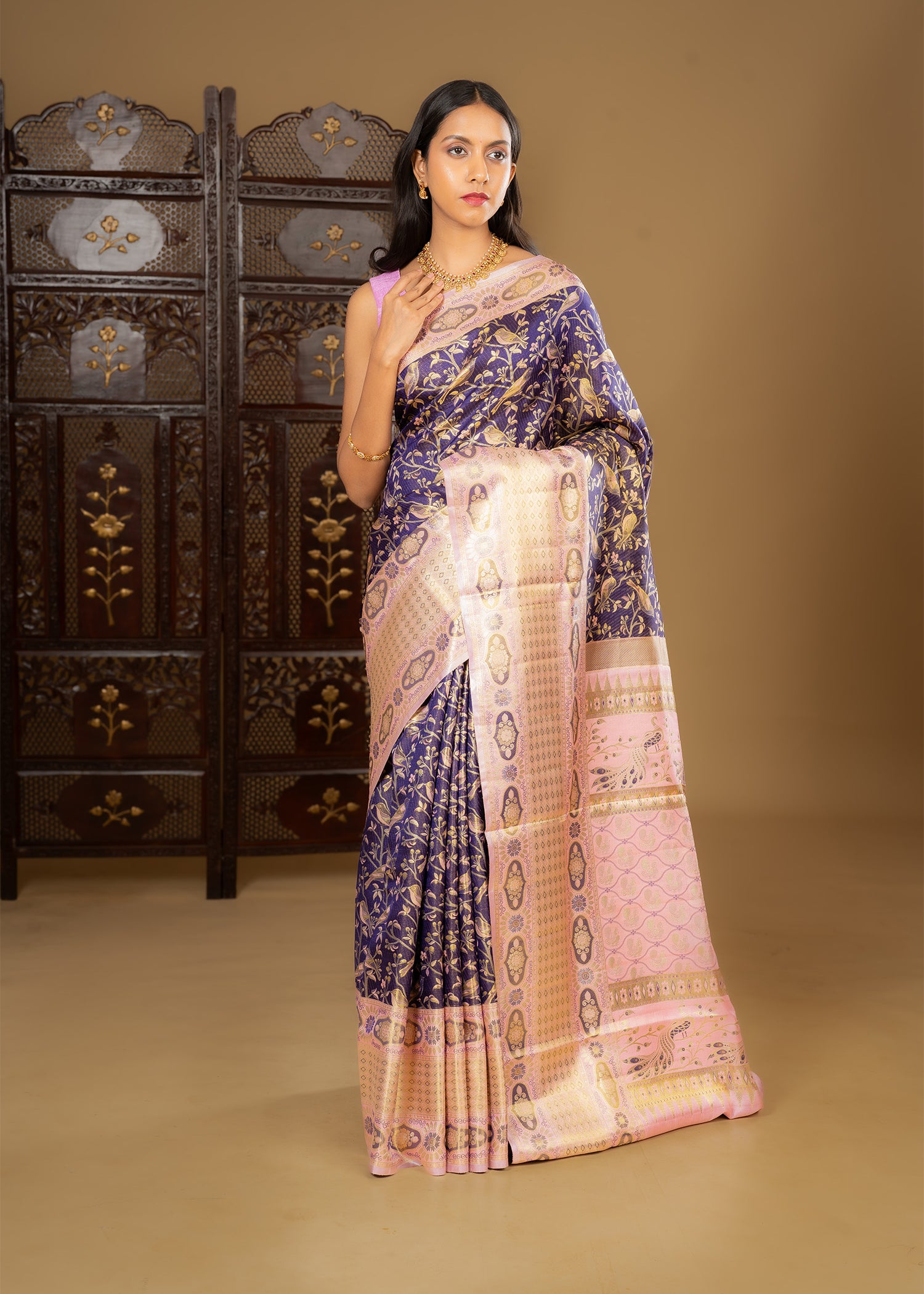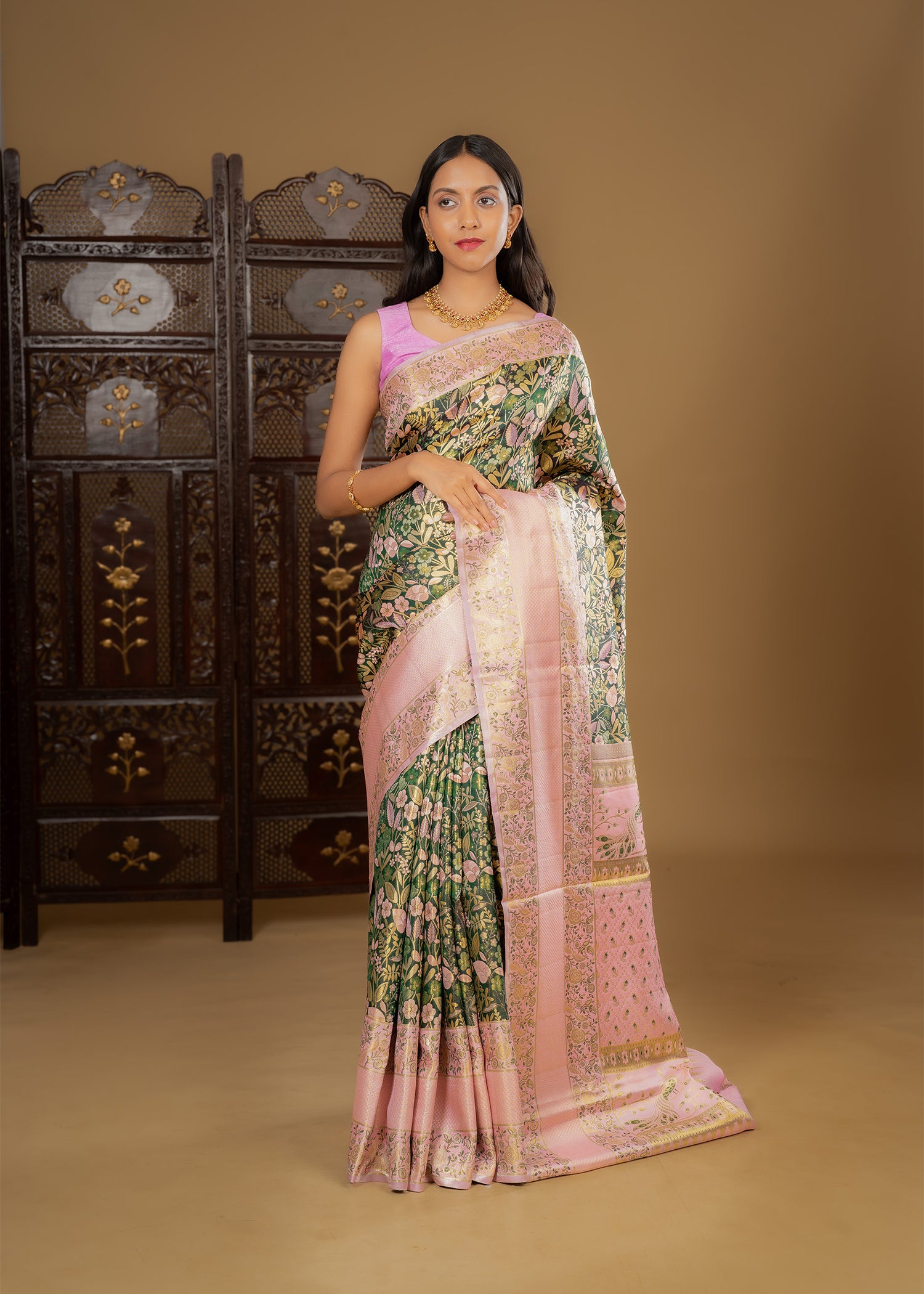 Golden Pink Floral Kanjivaram Silk Saree