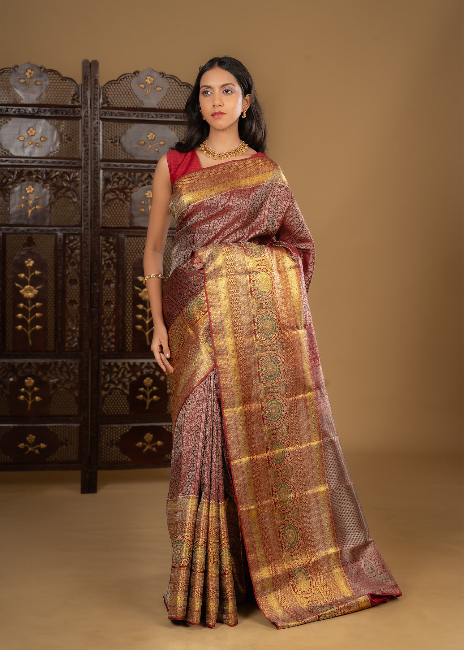 Deep Maroon Floral Kanjivaram Silk Saree