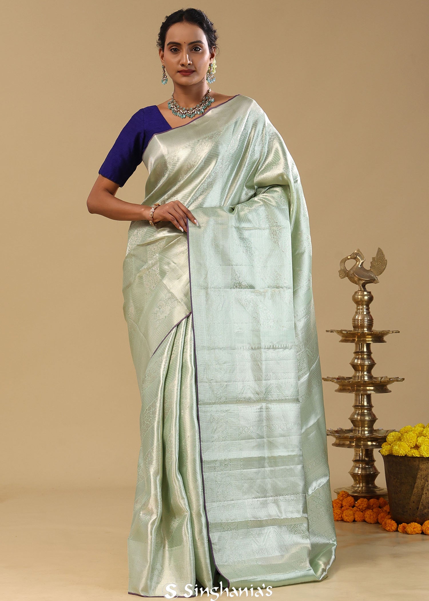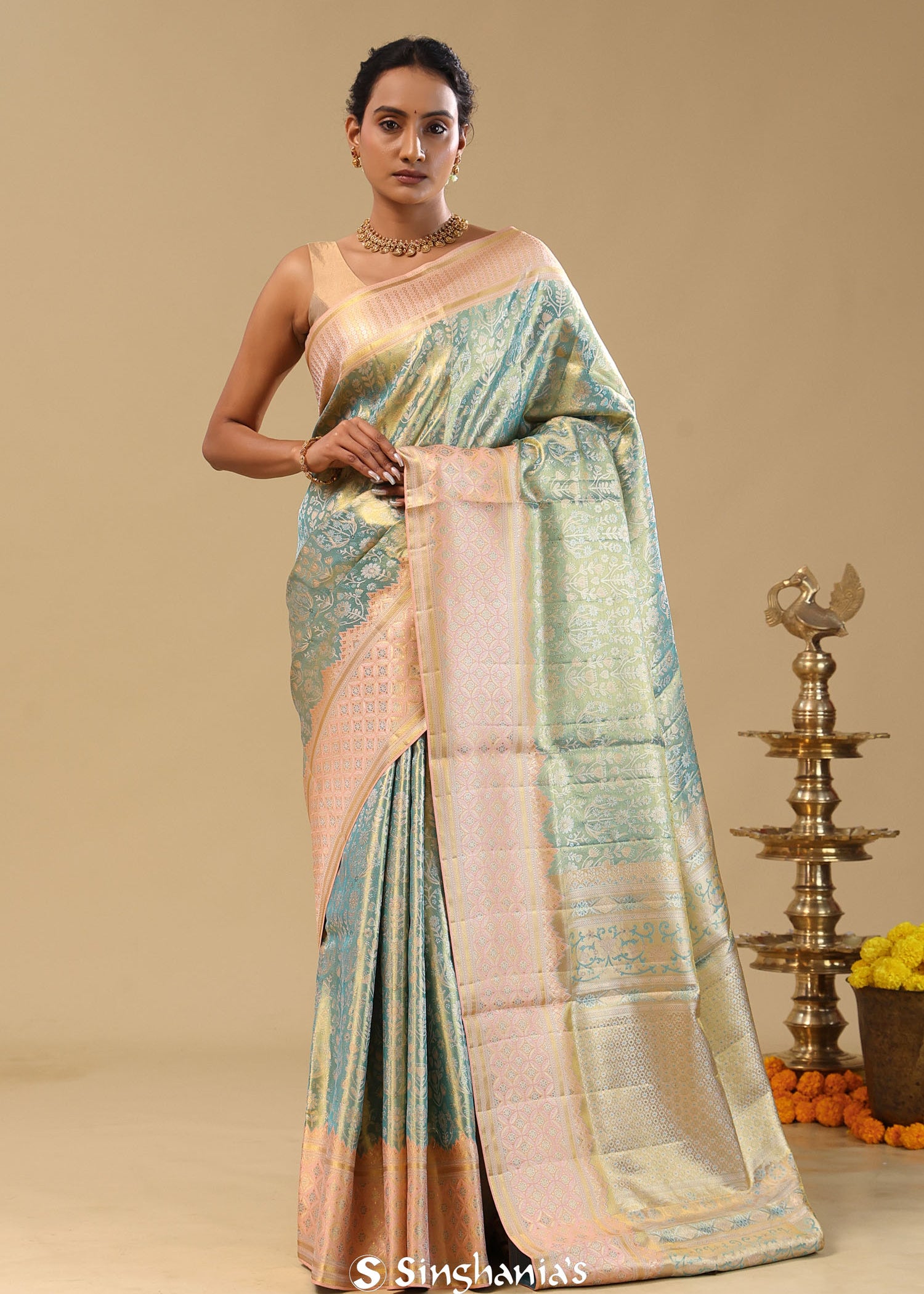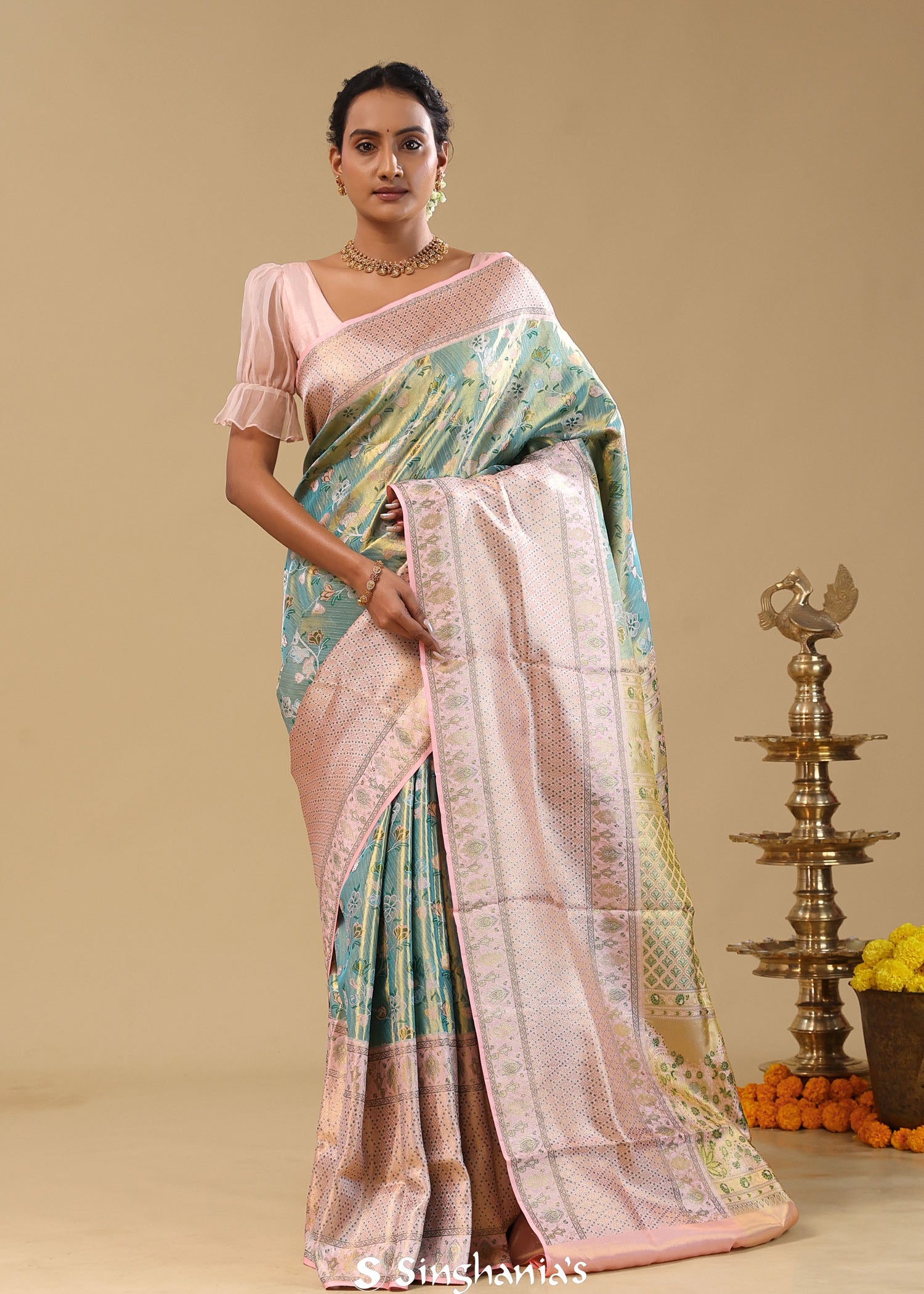 Pale Green Kanjivaram Tissue Saree With Floral Design