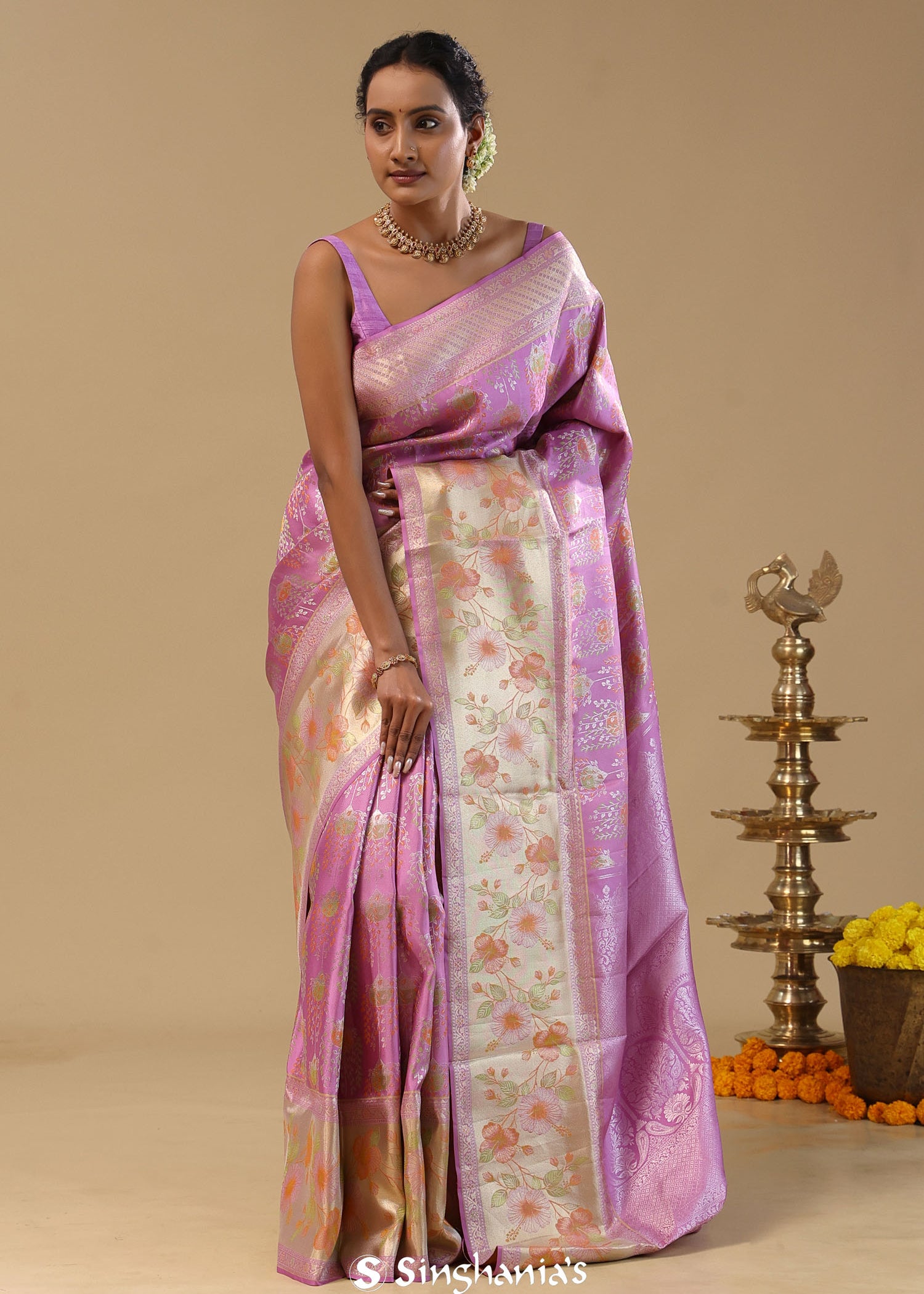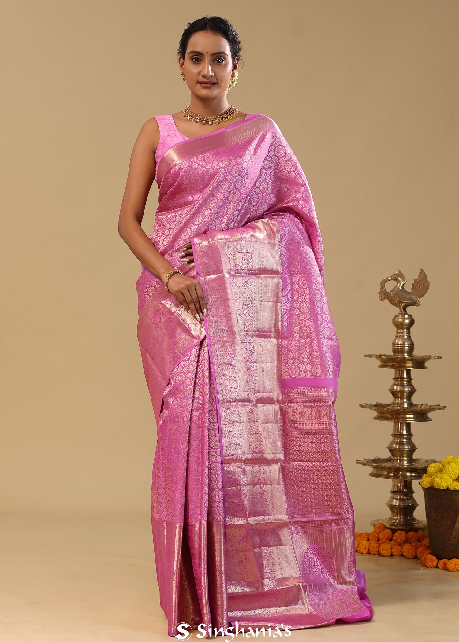 Pink Kanjivaram Silk Saree With Floral Design