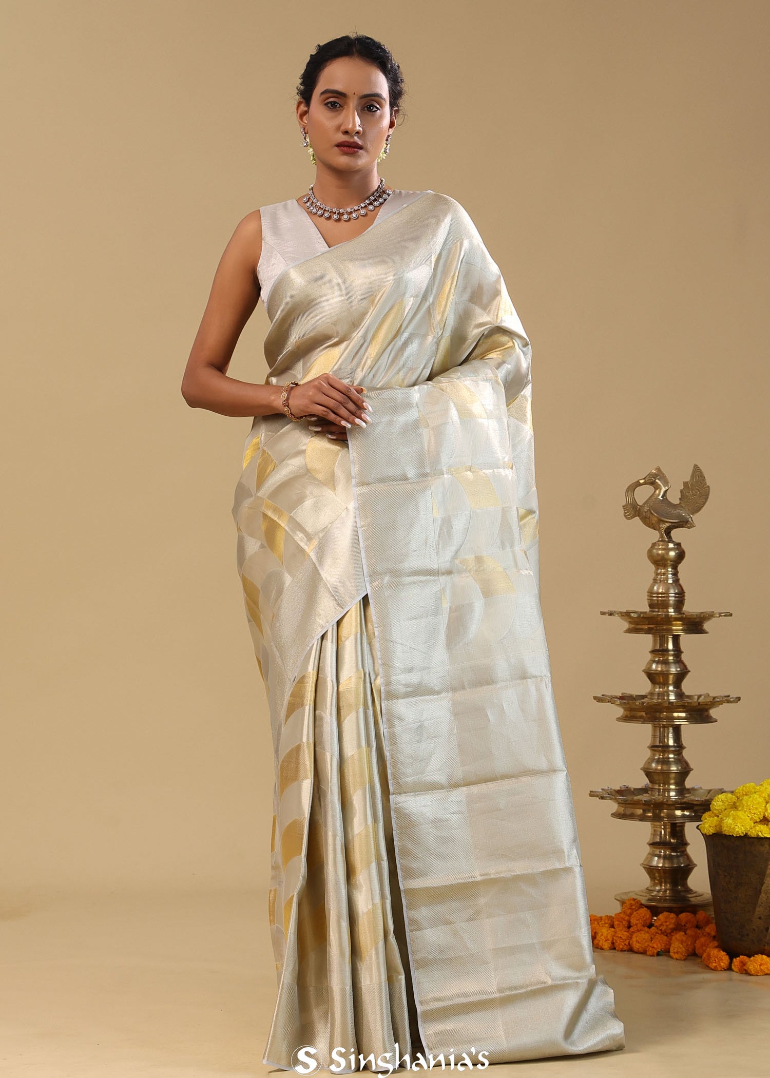 Silver Kanjivaram Tissue Saree With Scallop Design
