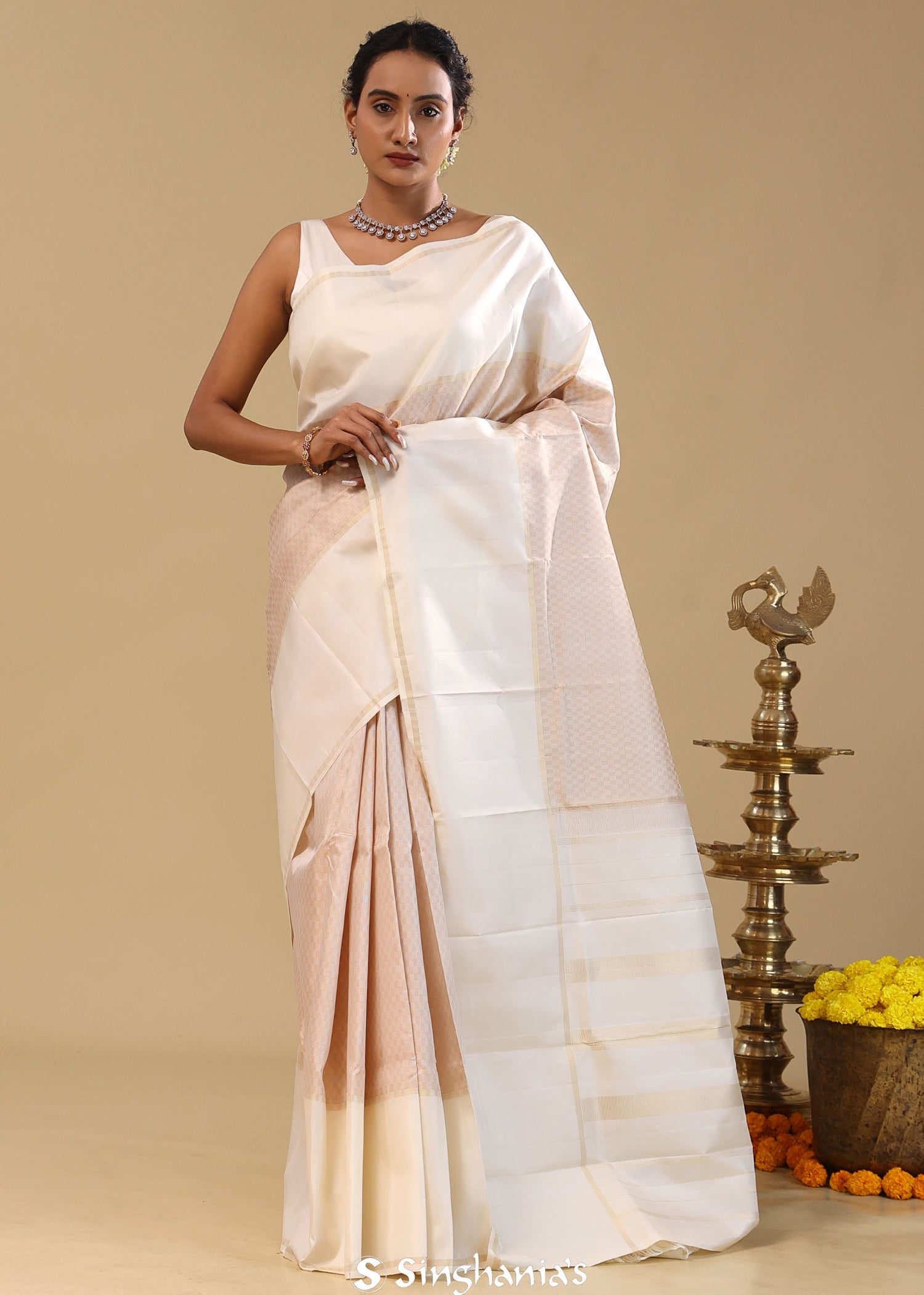 Off White Kanjivaram Silk Saree With Gold Zari Border