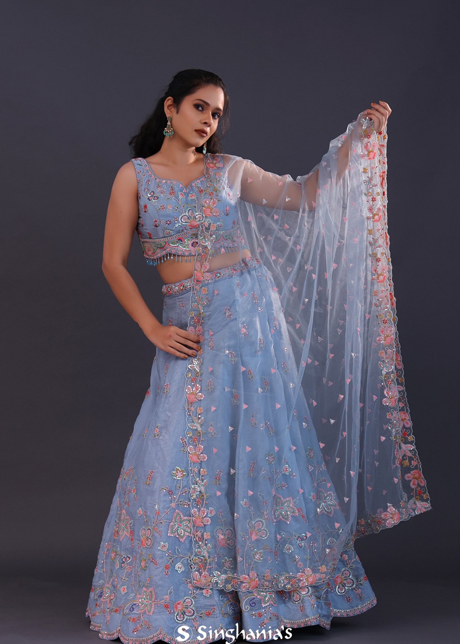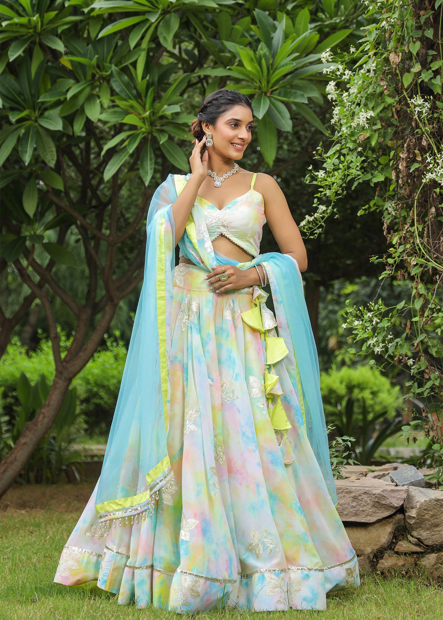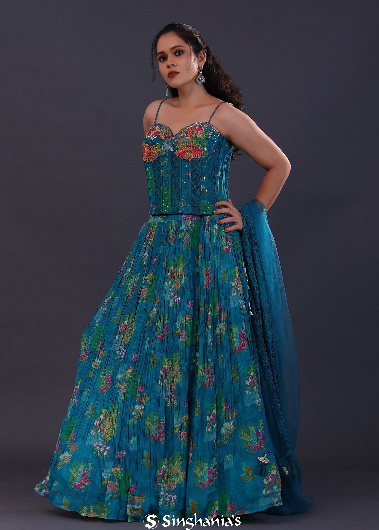 Cerulean Blue Georgette Floral Printed Lehenga Set