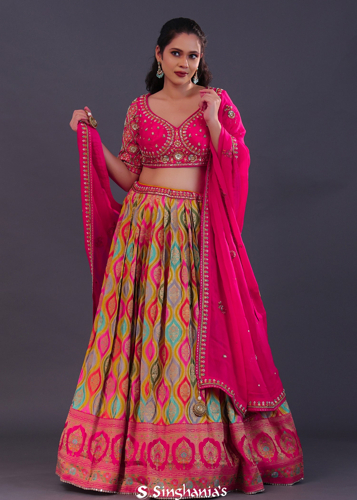 Bright Pink Brocade Silk Bandhani Printed Lehenga Set
