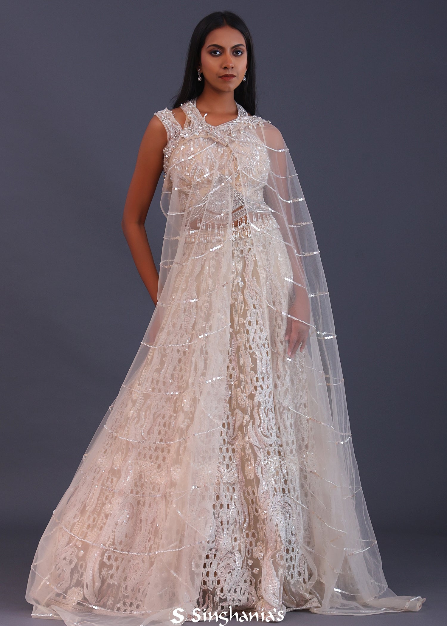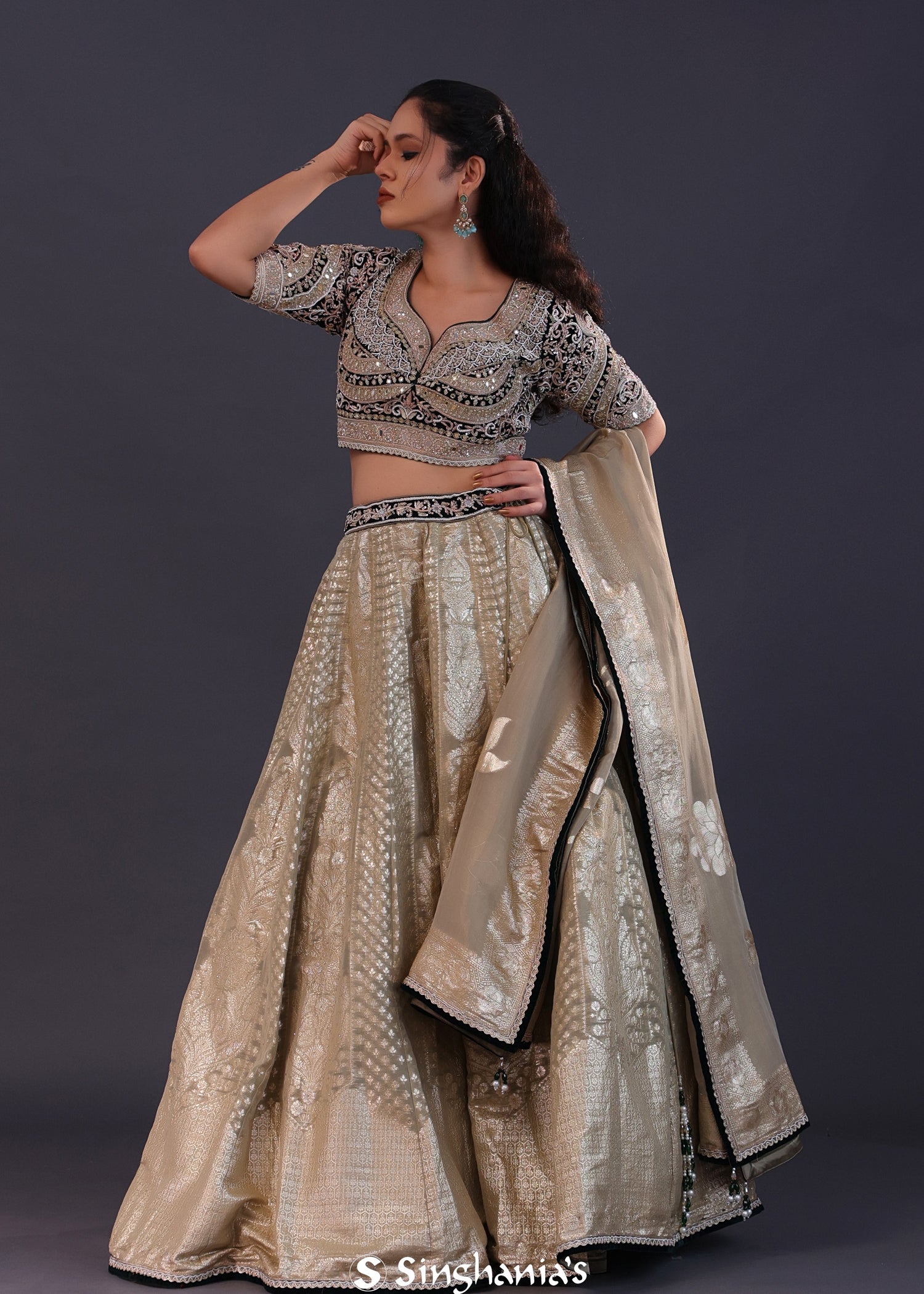 Silver Beige Banarasi Silk Embroidered Lehenga Set