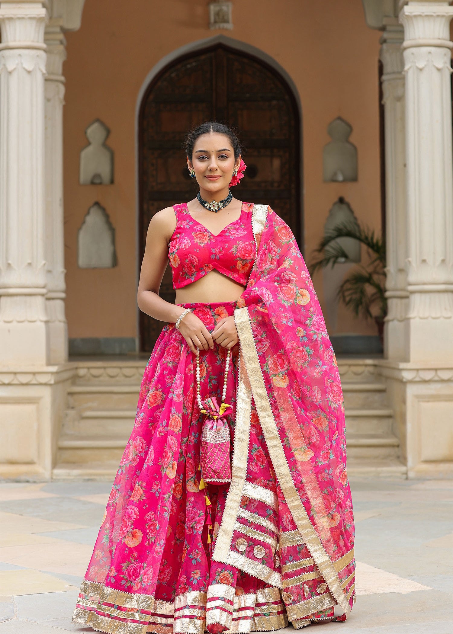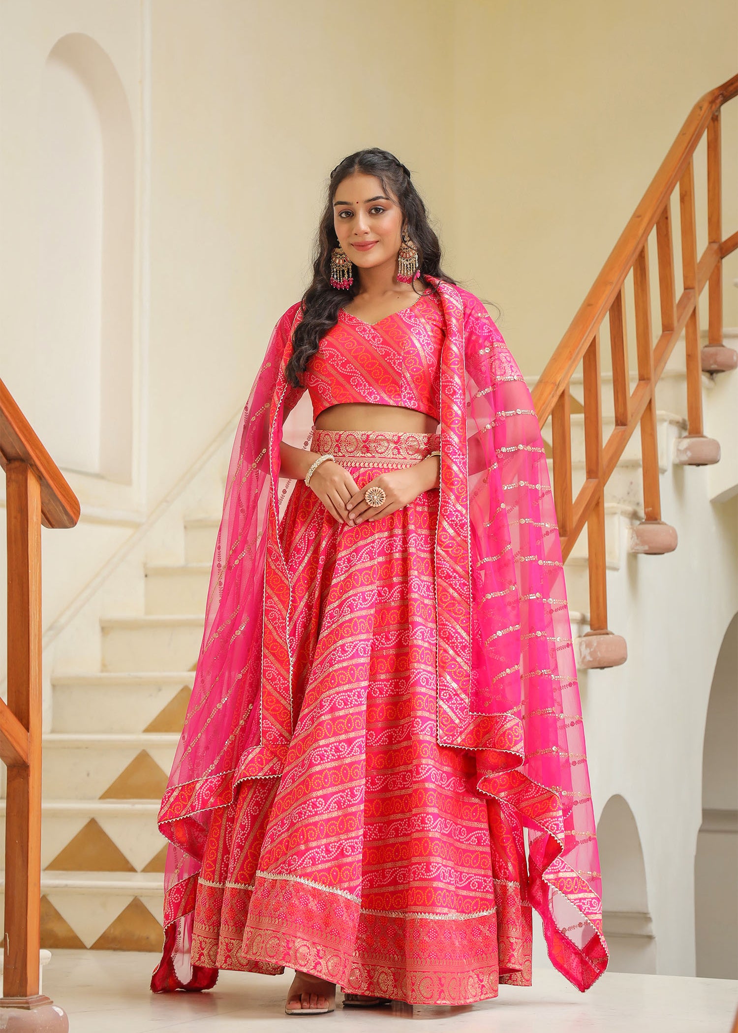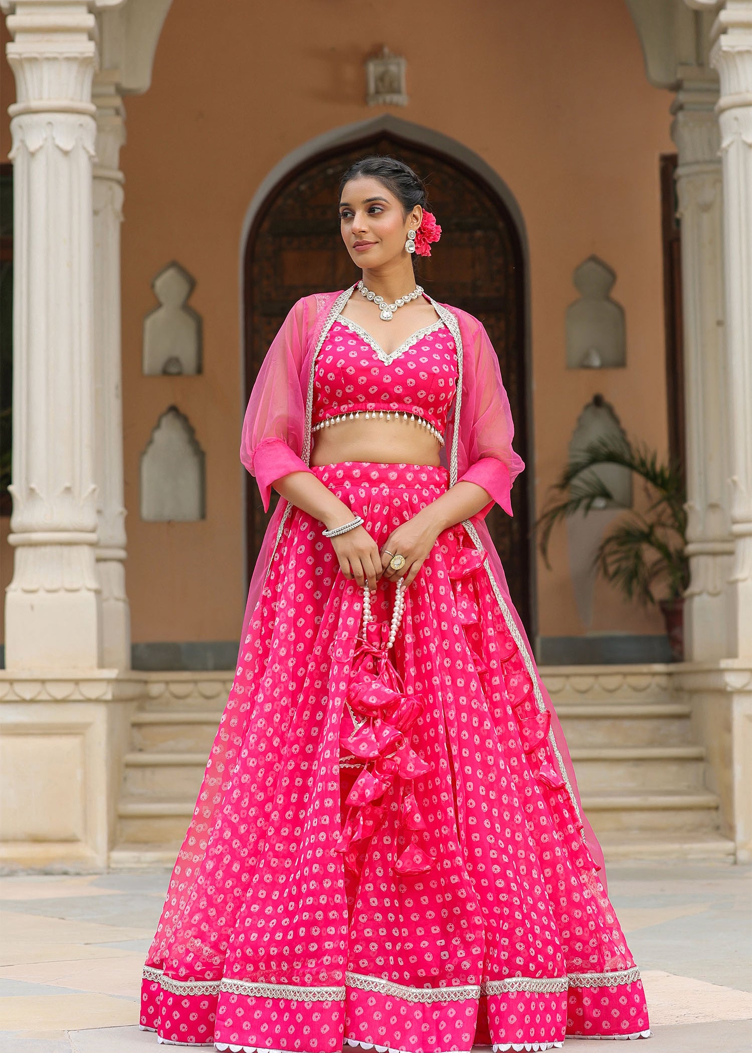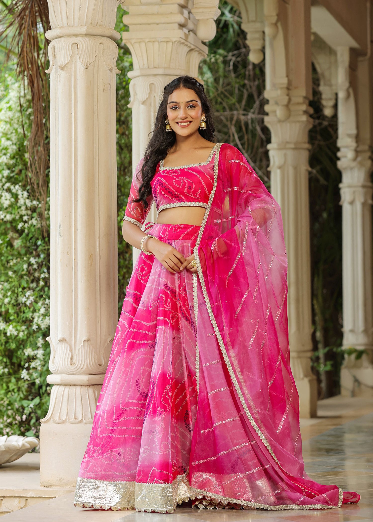 Bright Pink Organza Bandhani Printed Lehenga Set