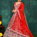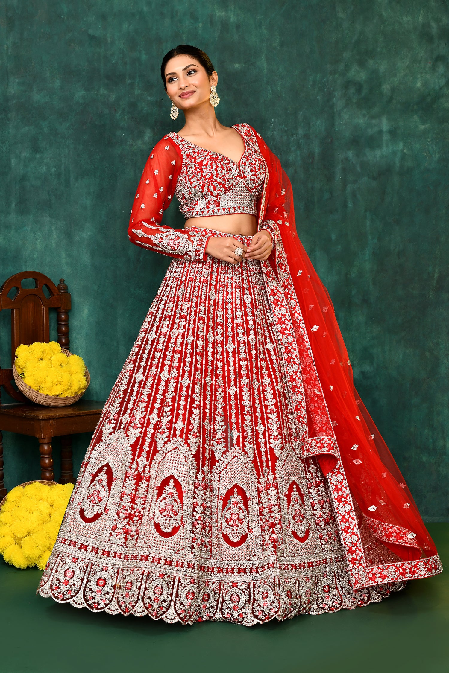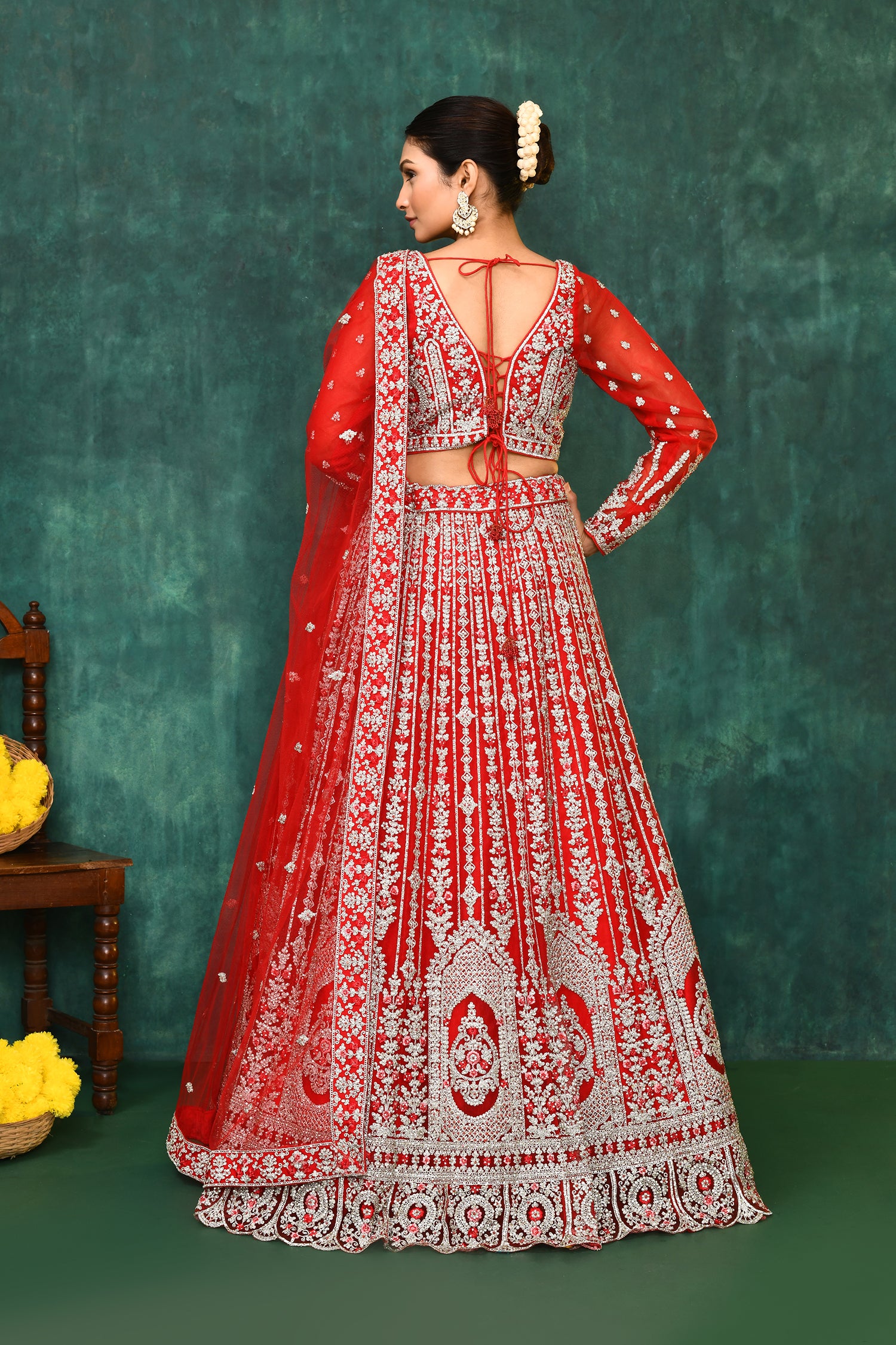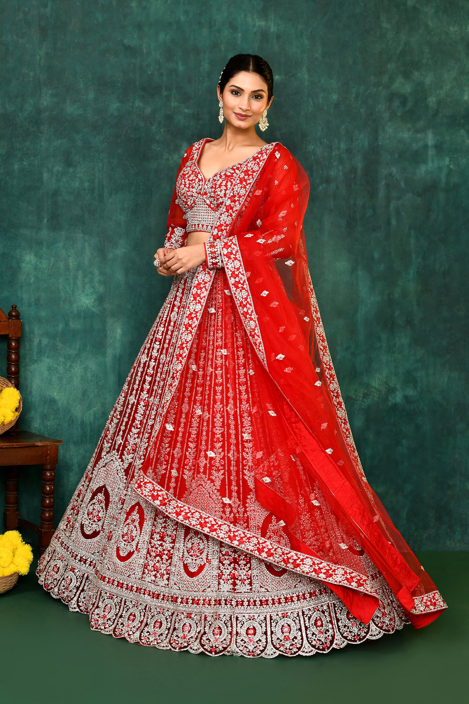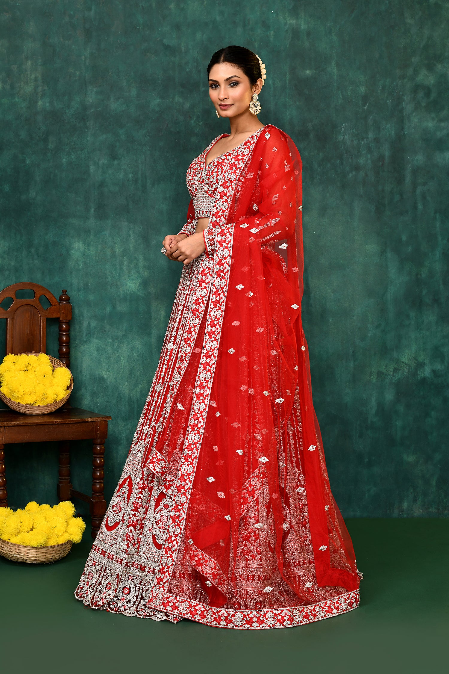The candy red net embroidered lehenga set with V-neck with matching blouse and dupatta for a rich elegant look with grace.