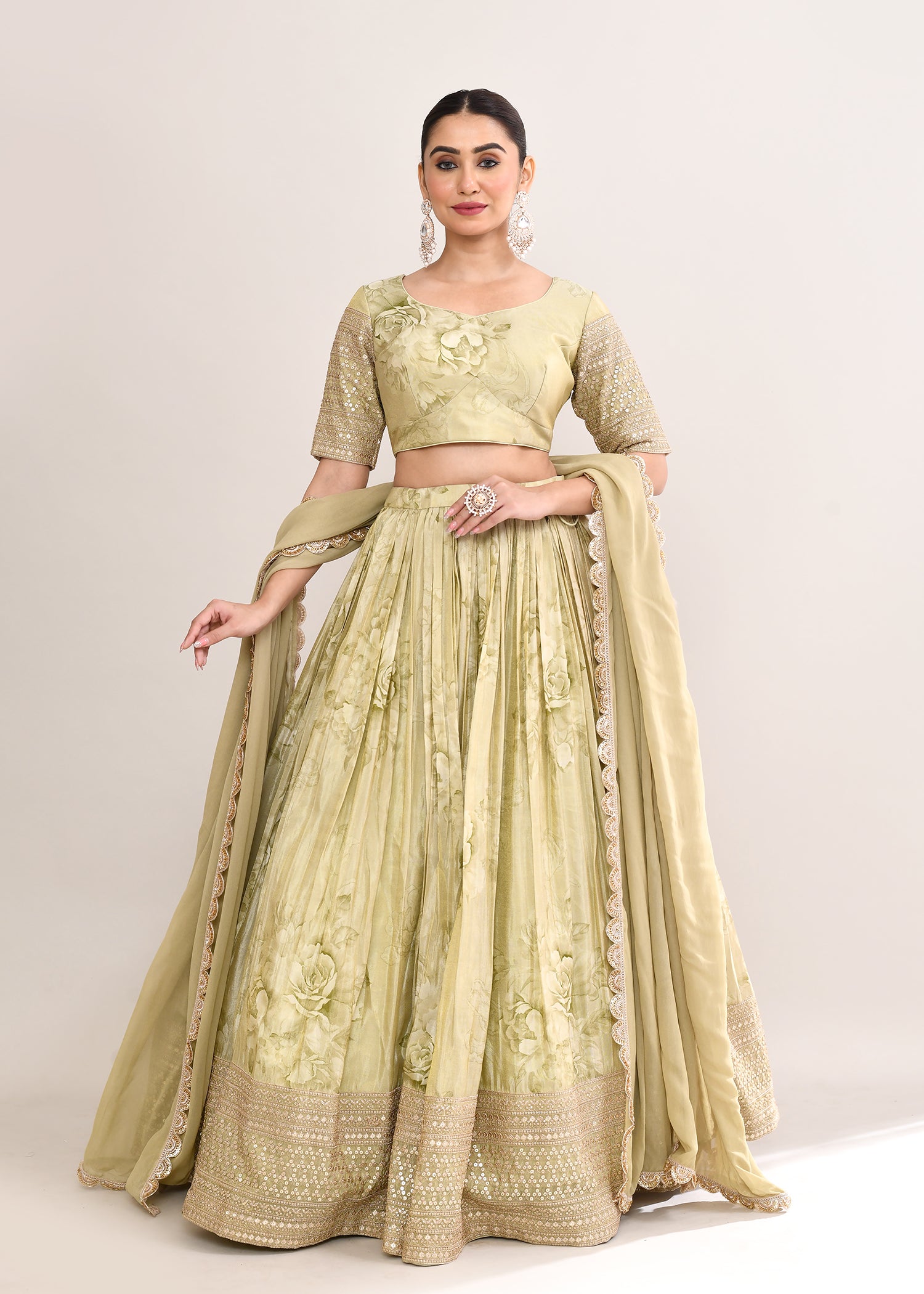 Muted Pastel Green Satin Floral Printed Lehenga Set