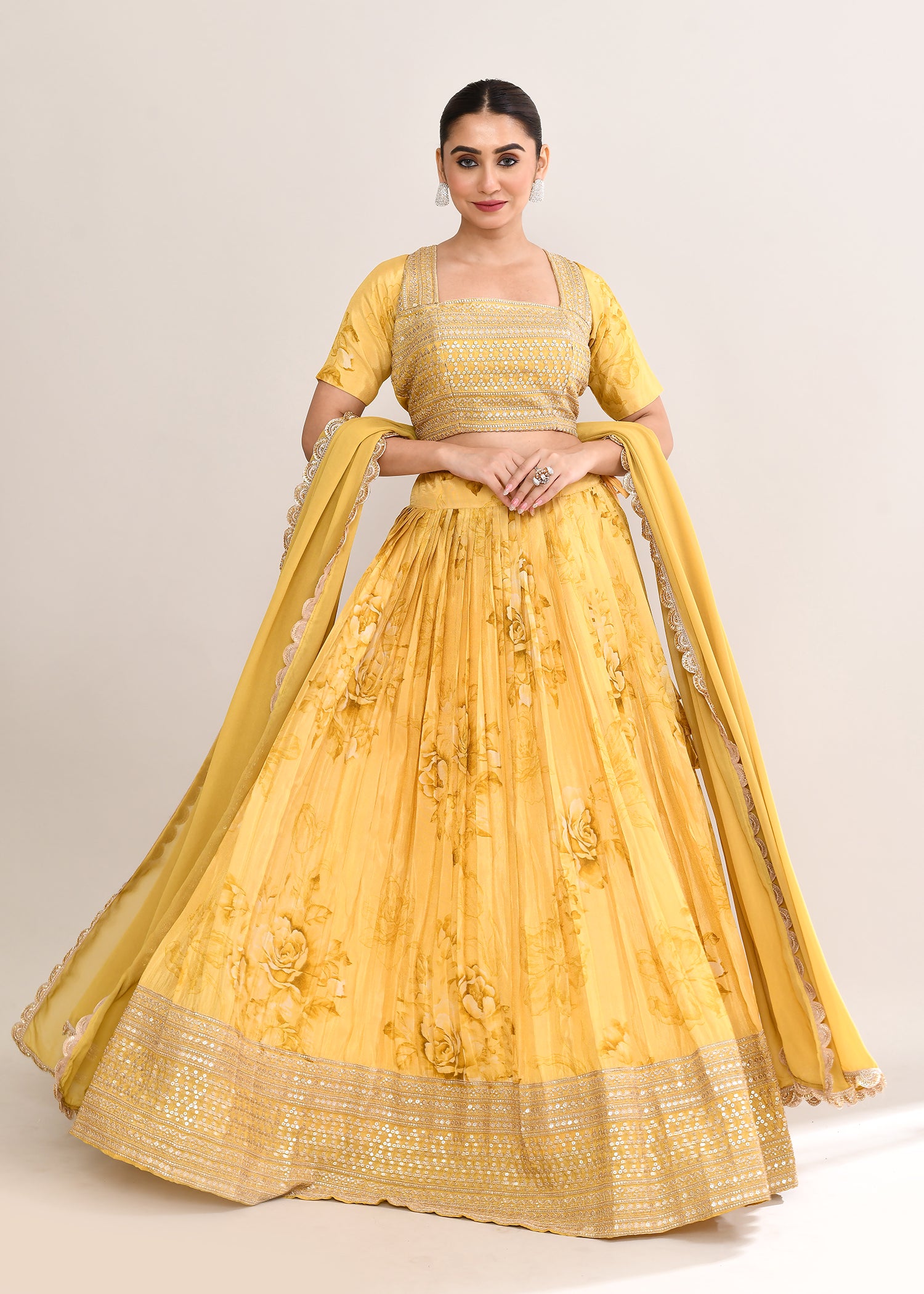 Bright Yellow Raw Silk Floral Printed Lehenga Set