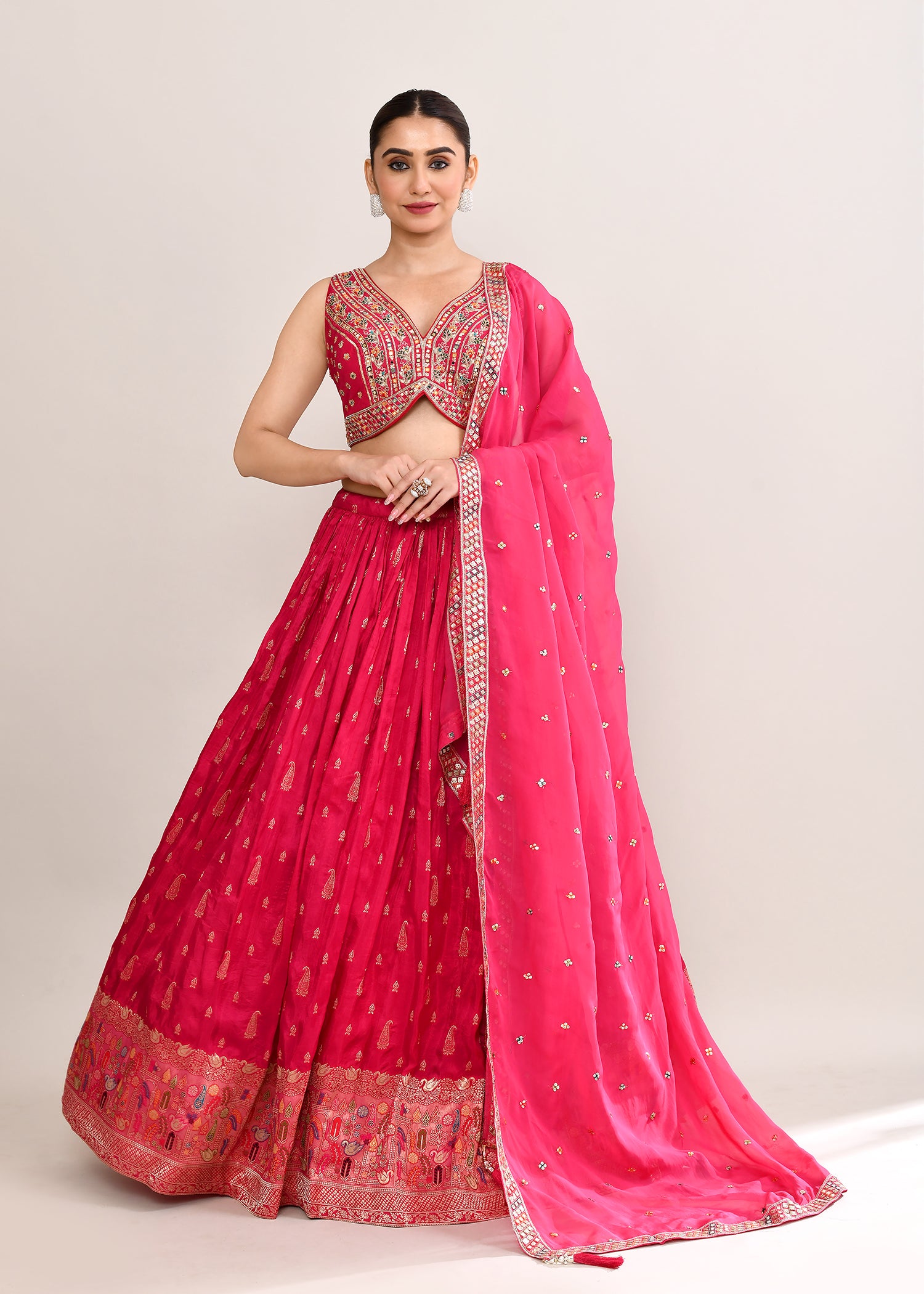 Bright Pink Tissue Banarasi Embroidered Lehenga Set