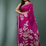 The floral printed design on the body of Burnt pink pure silk saree complemented with unstitched blouse