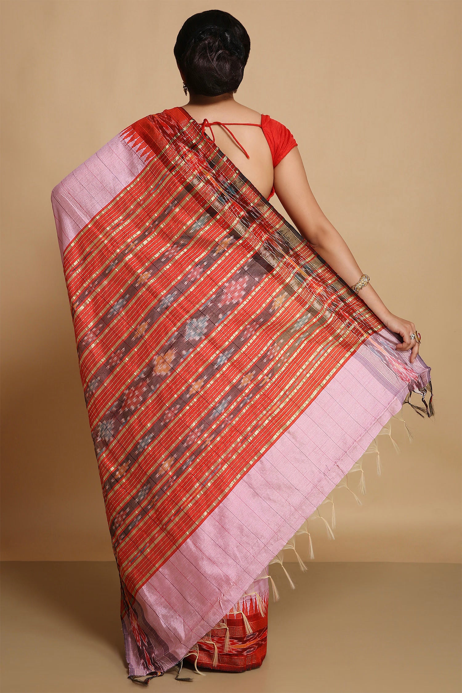 This horizontal lines formed on the body of Classic rose pink pure raw silk saree along with contrast red ikat border is a ideal choice for any occasion.Making you satisfy with each drape.