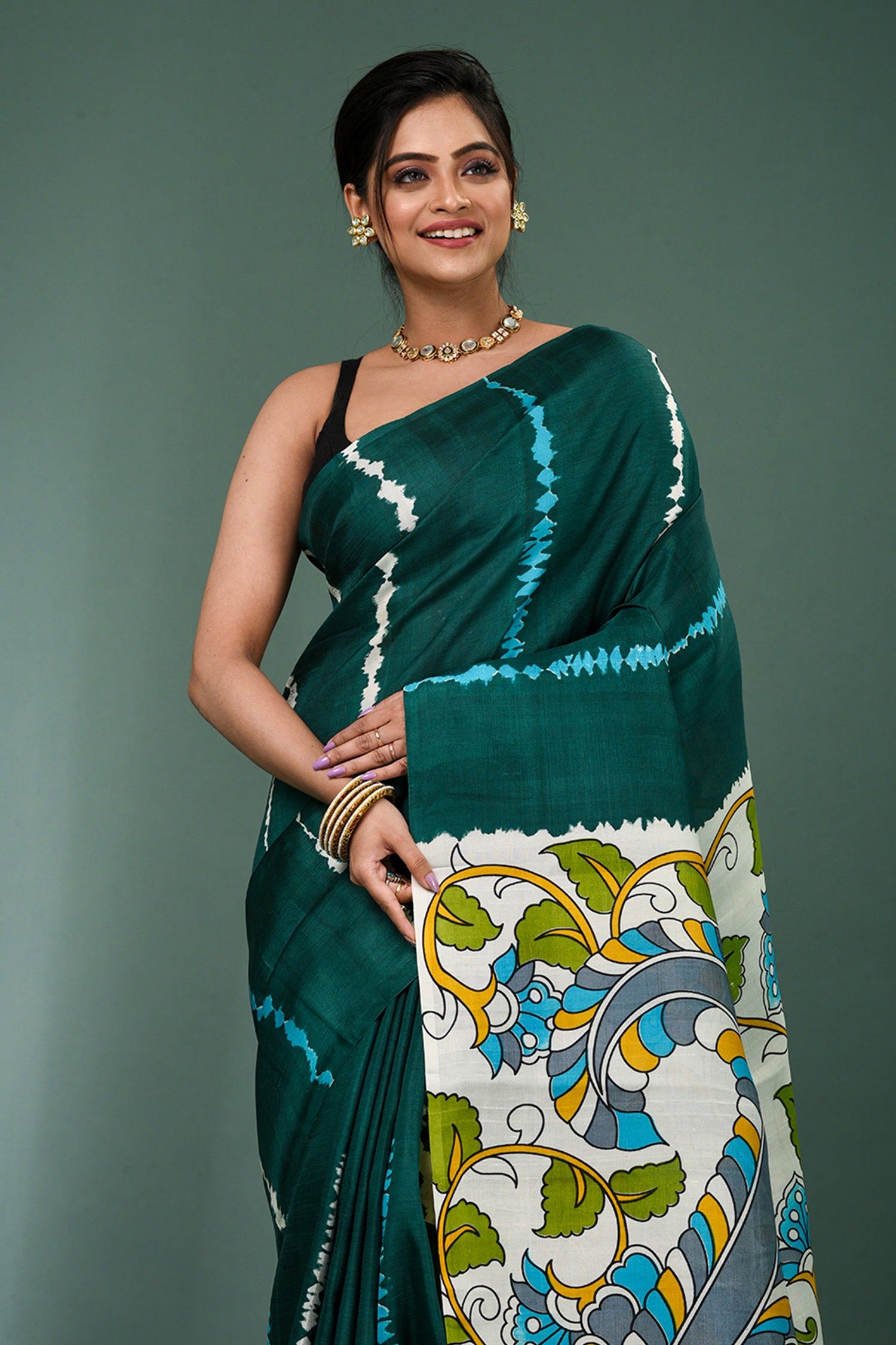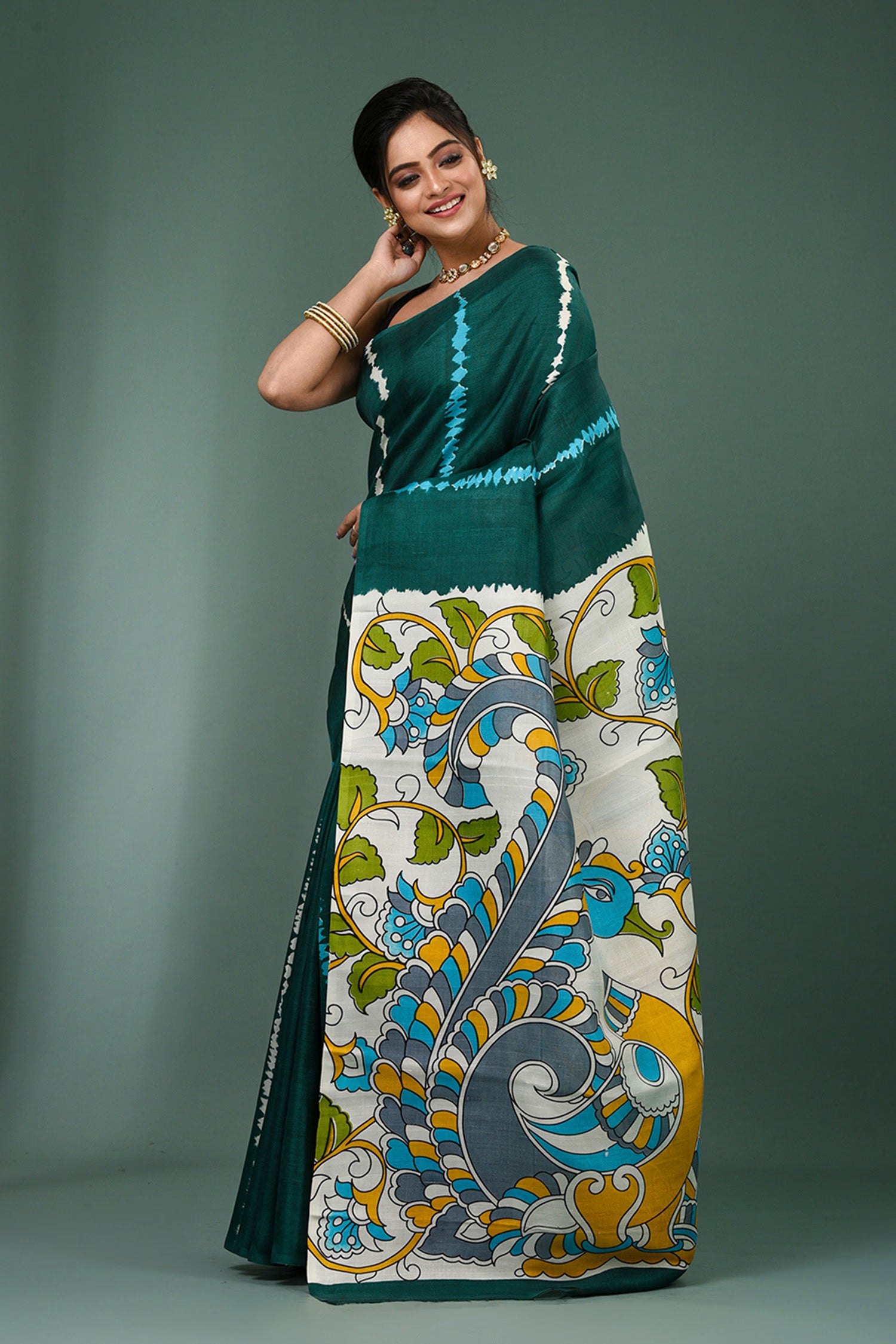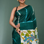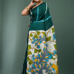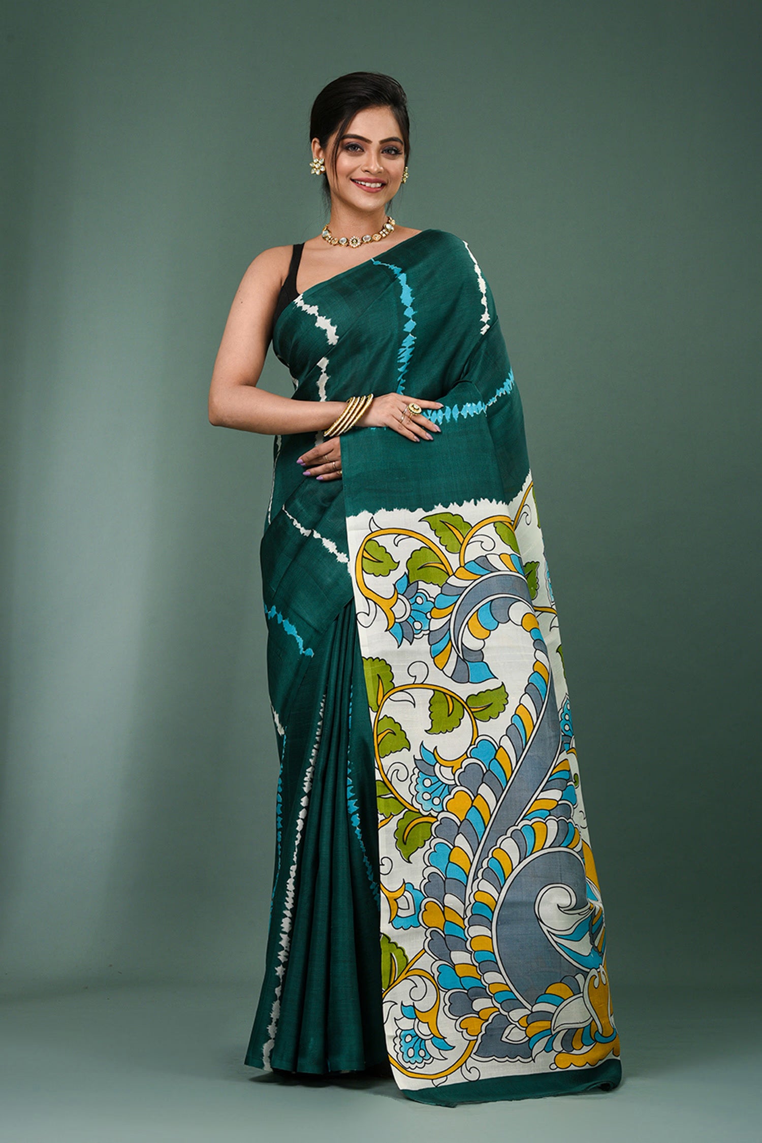 The stripes printed on the body of Dark teal pure silk saree complemented with unstitched blouse and painted pallu