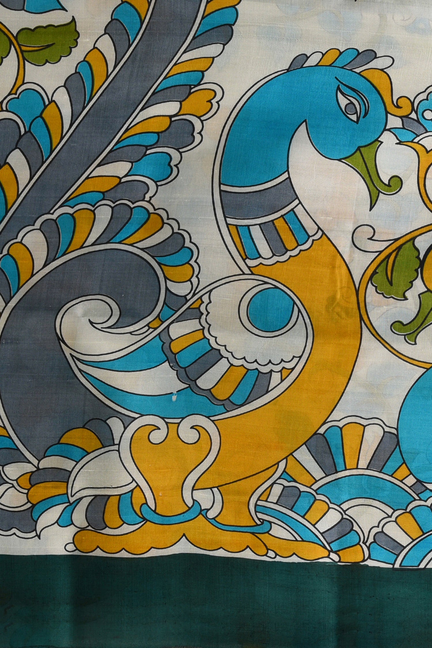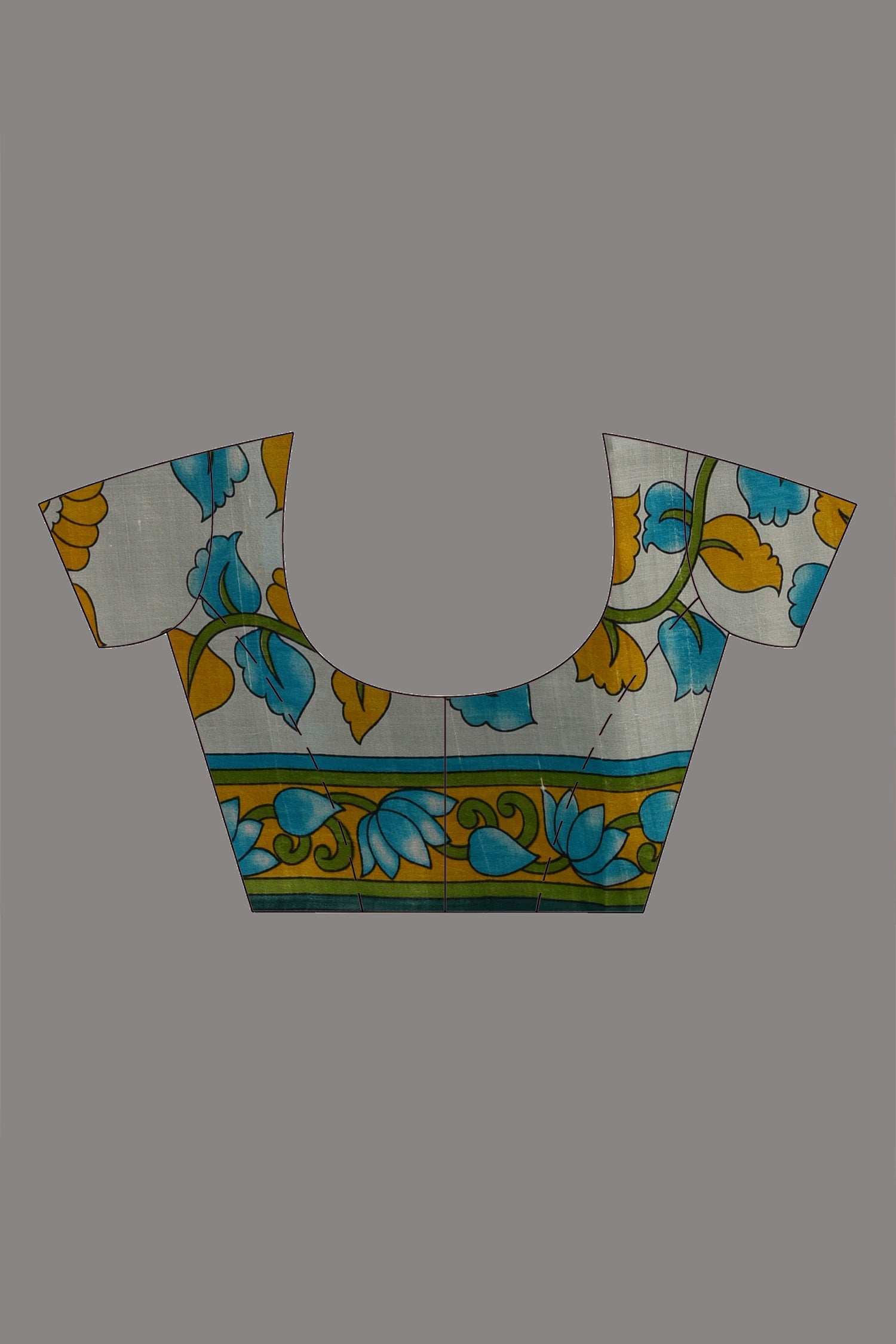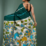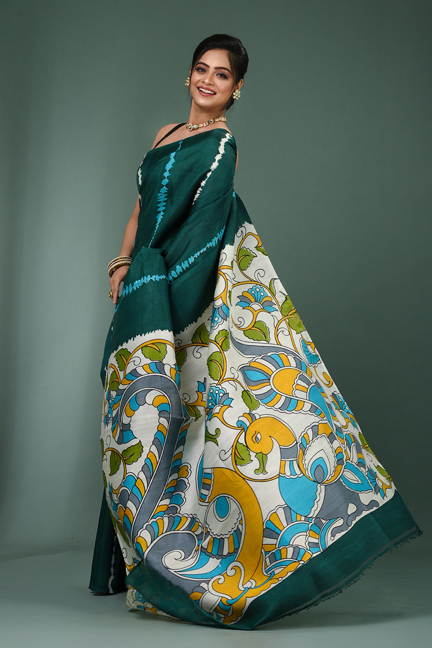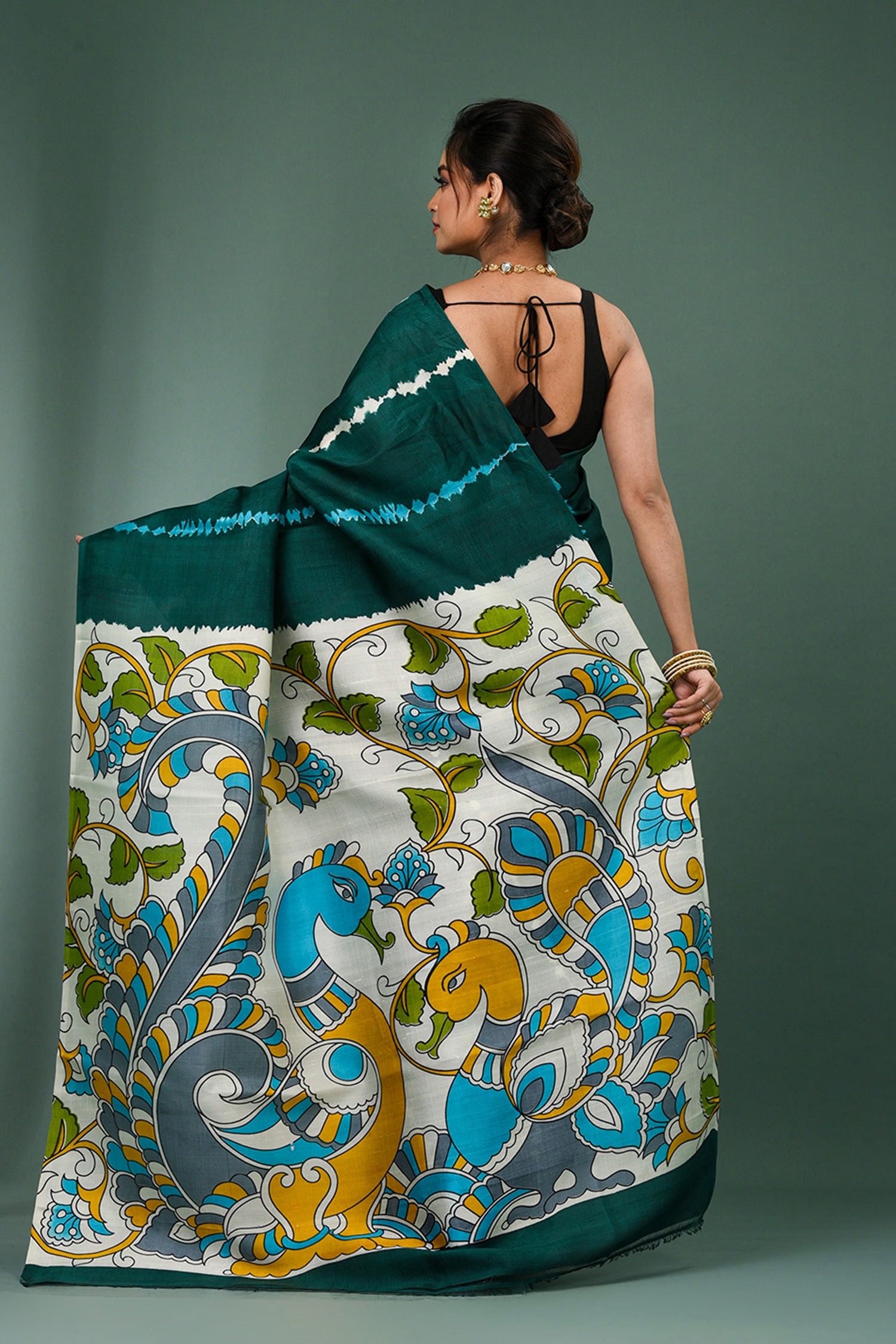 The stripes printed on the body of Dark teal pure silk saree complemented with unstitched blouse and painted pallu