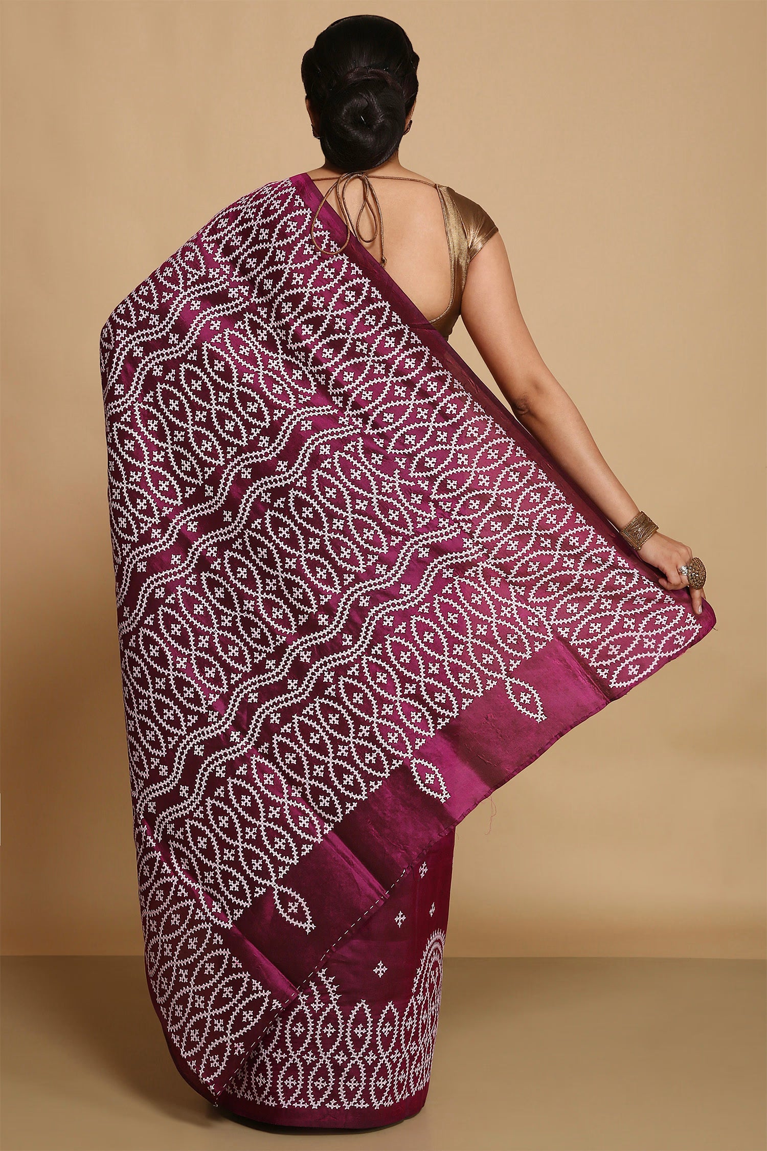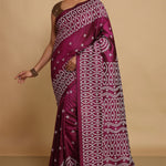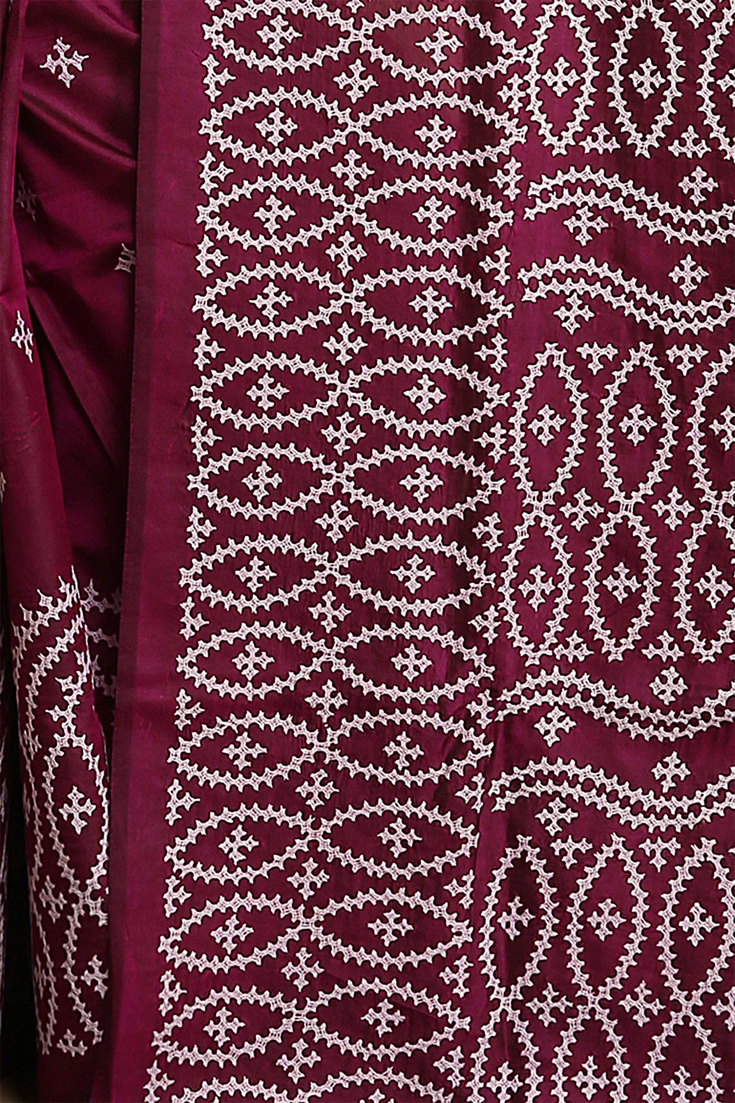This manually gujarati handcrafted presented on entire Velvety maroon pure bangalore silk saree which would light up every moment when you drape yourself with this .