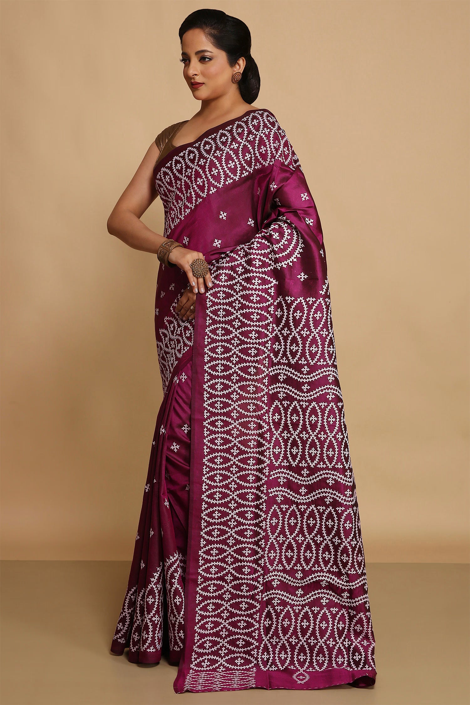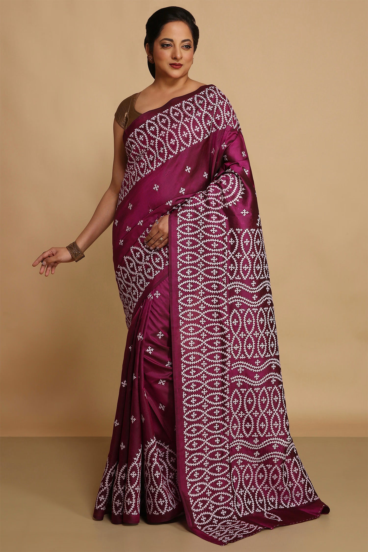 Pair with minimal jewellery and soft makeup to highlight the timeless elegance Singhania’s is known for.