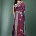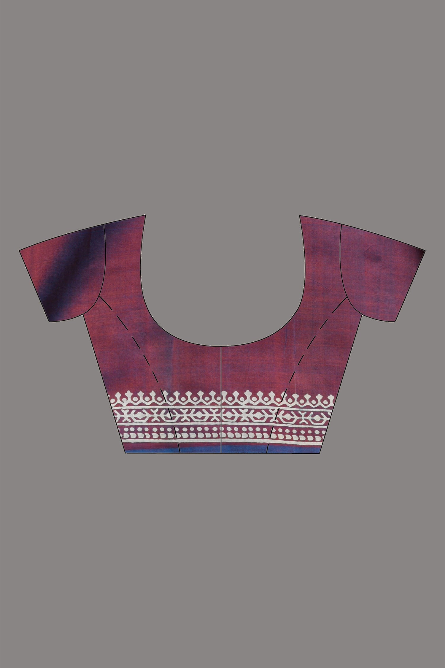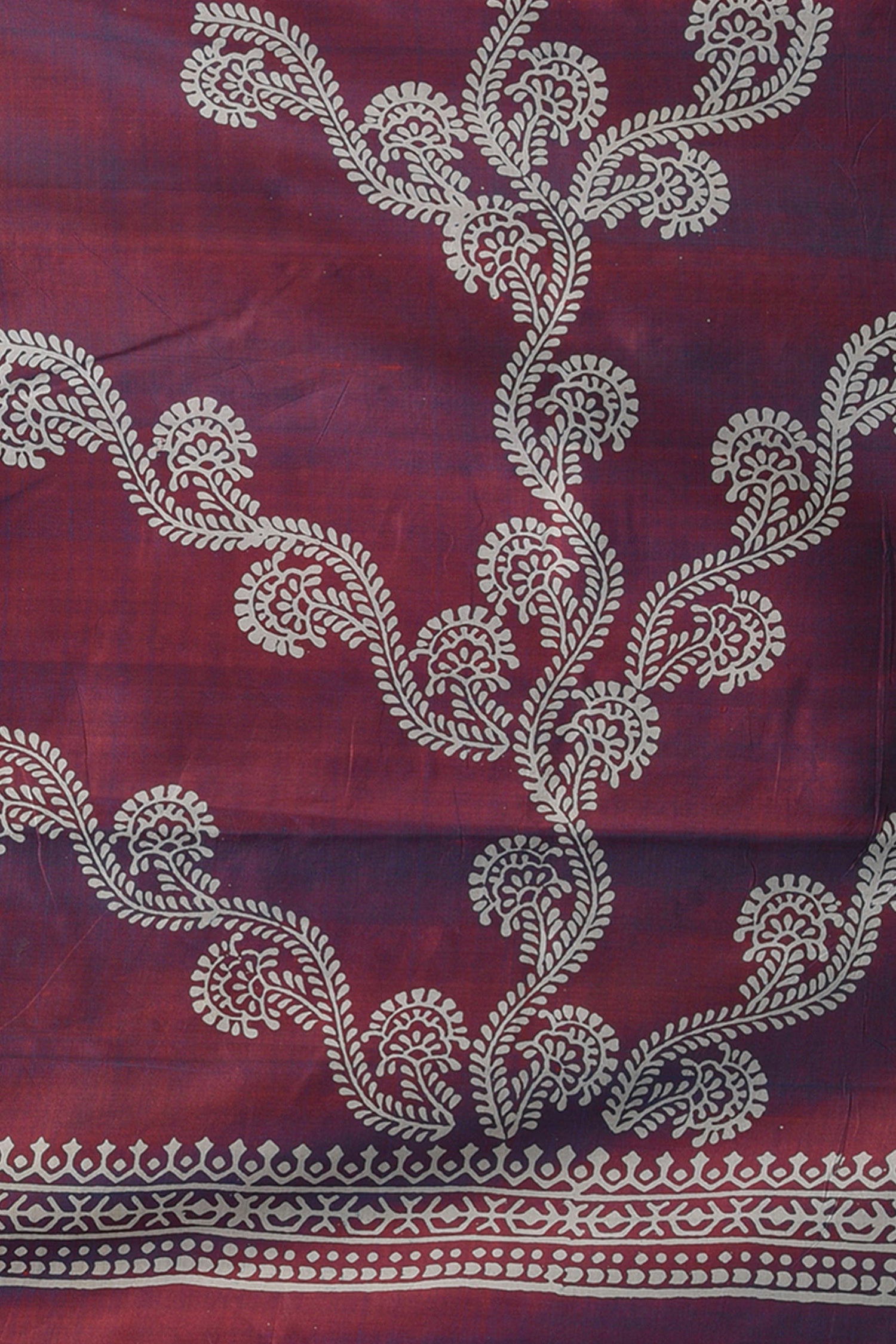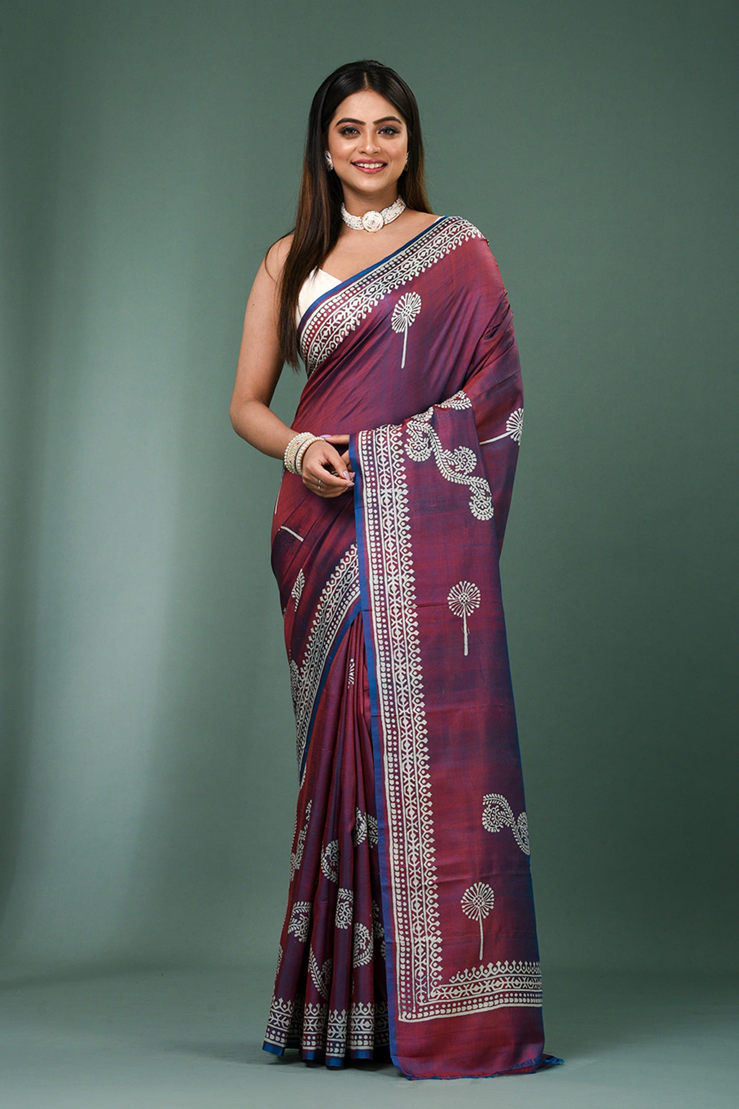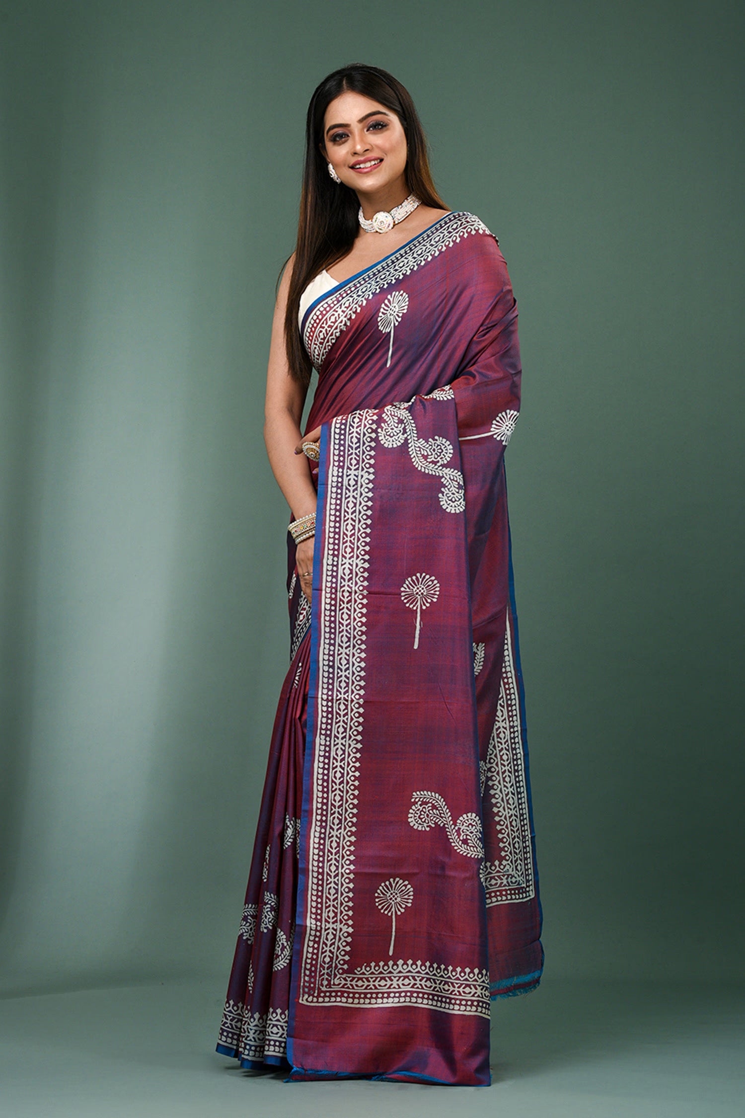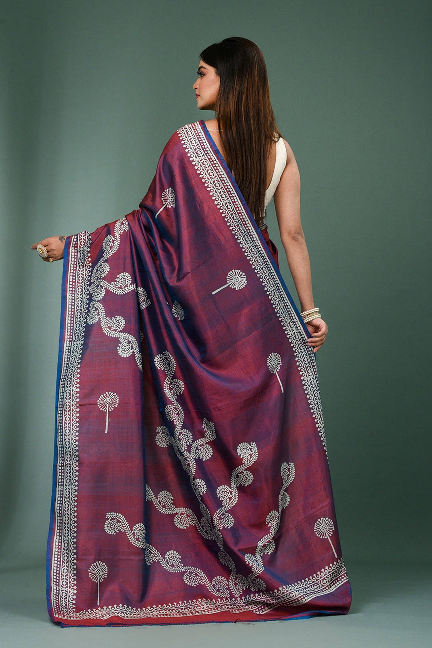 Own yourself this understated luxury of Wine katan silk saree adorned with printed floral design scattered on body accompanied with self border ,blue edge and unstitched blouse to give a finishing touch .
