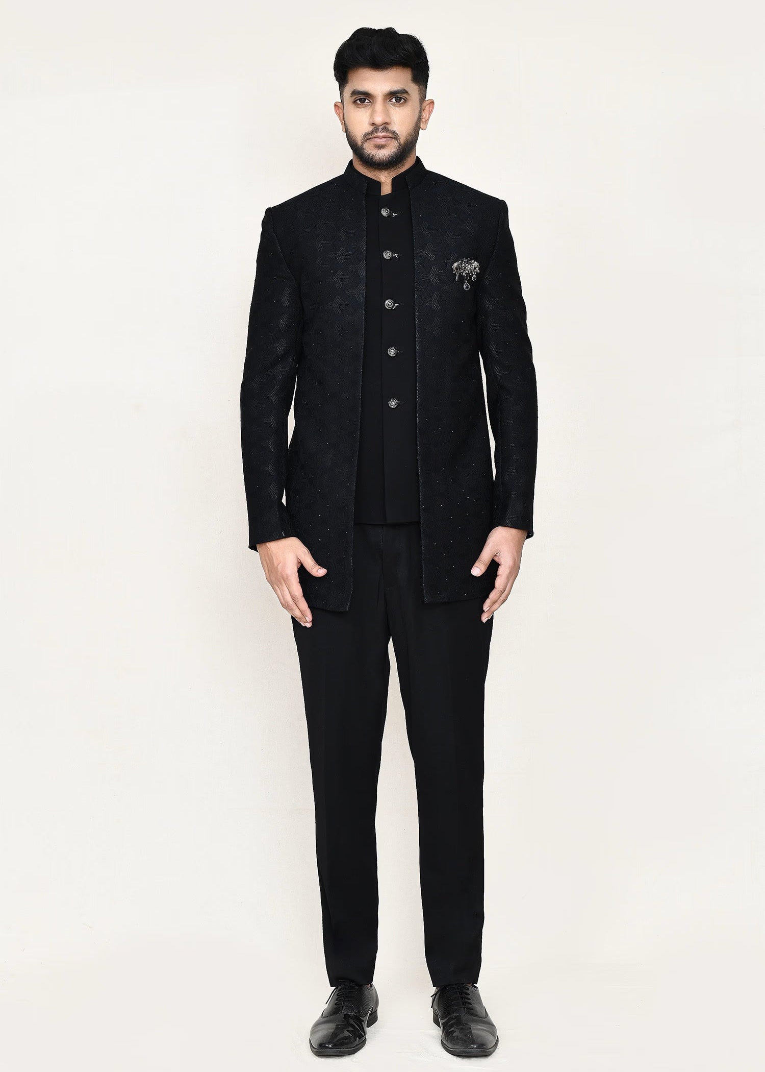 Black Jacquard Solid Sherwani Set