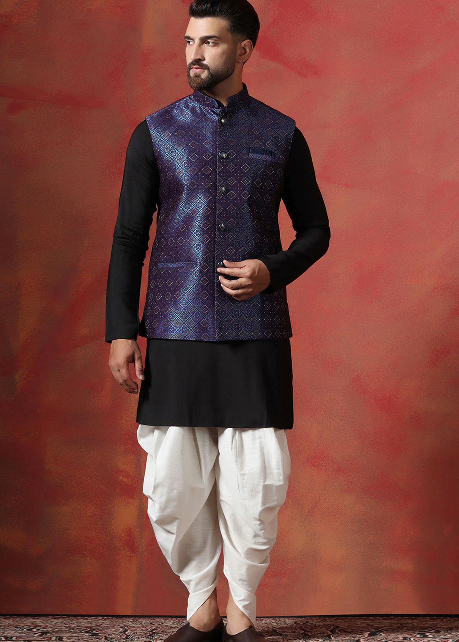 Black Jacquard Solid Kurta Set With Indigo Nehru Jacket