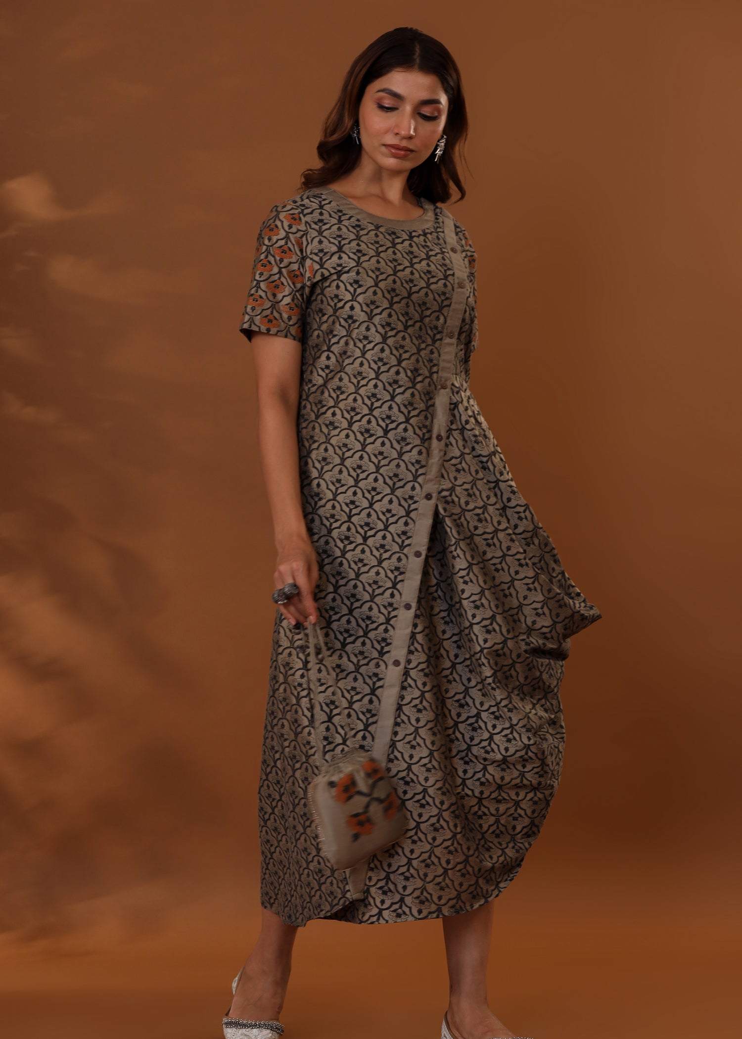 Brown Handcrafted One Side Drape Cotton Silk Chola Dress