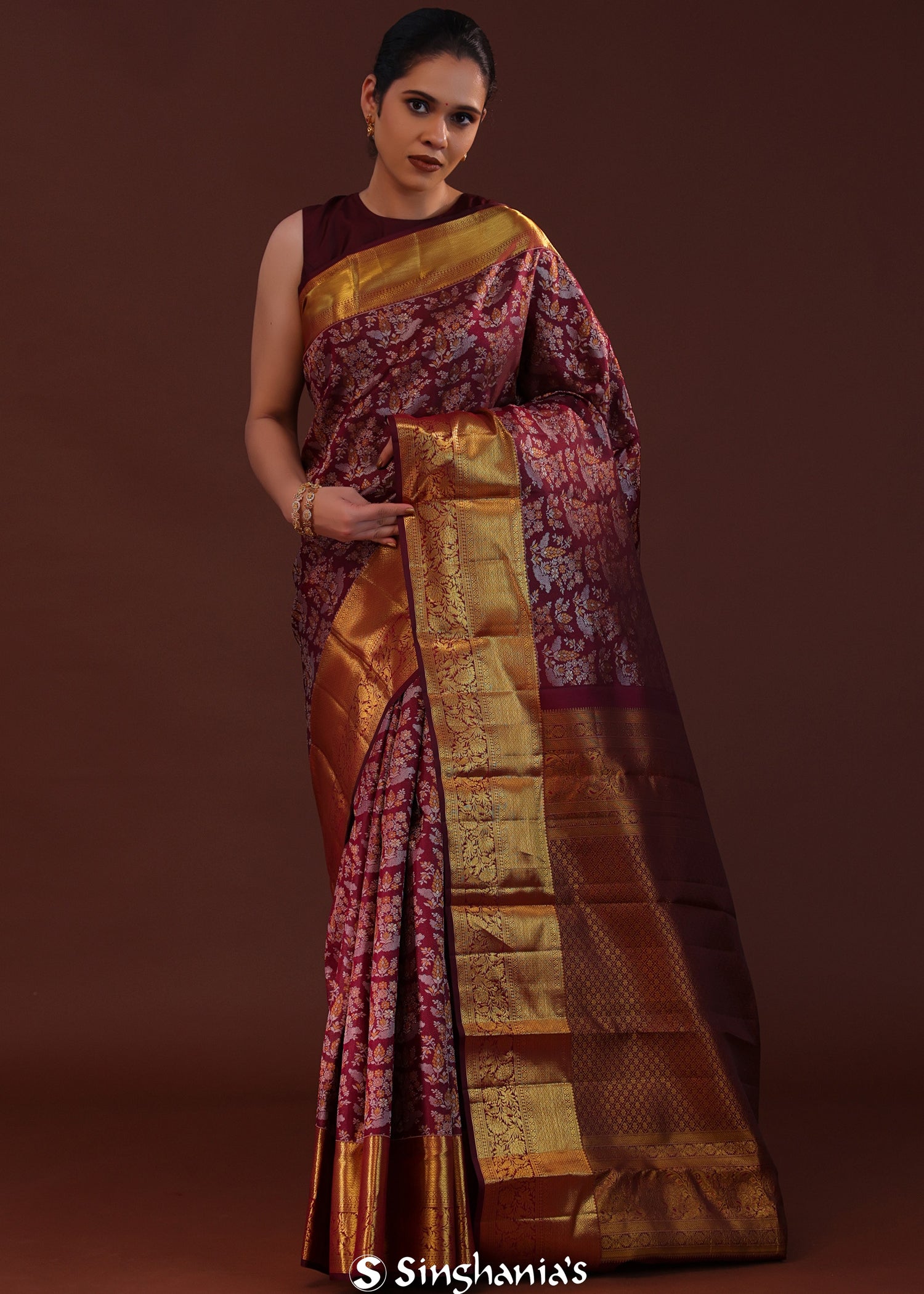 Cashmere Brown Kanjivaram Silk Saree With Floral Jaal Weaving