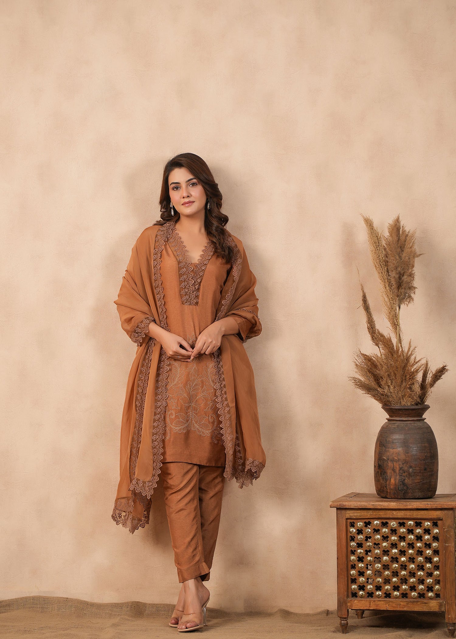 Chocolate Brown Russian Silk Embroidered Kurti Set