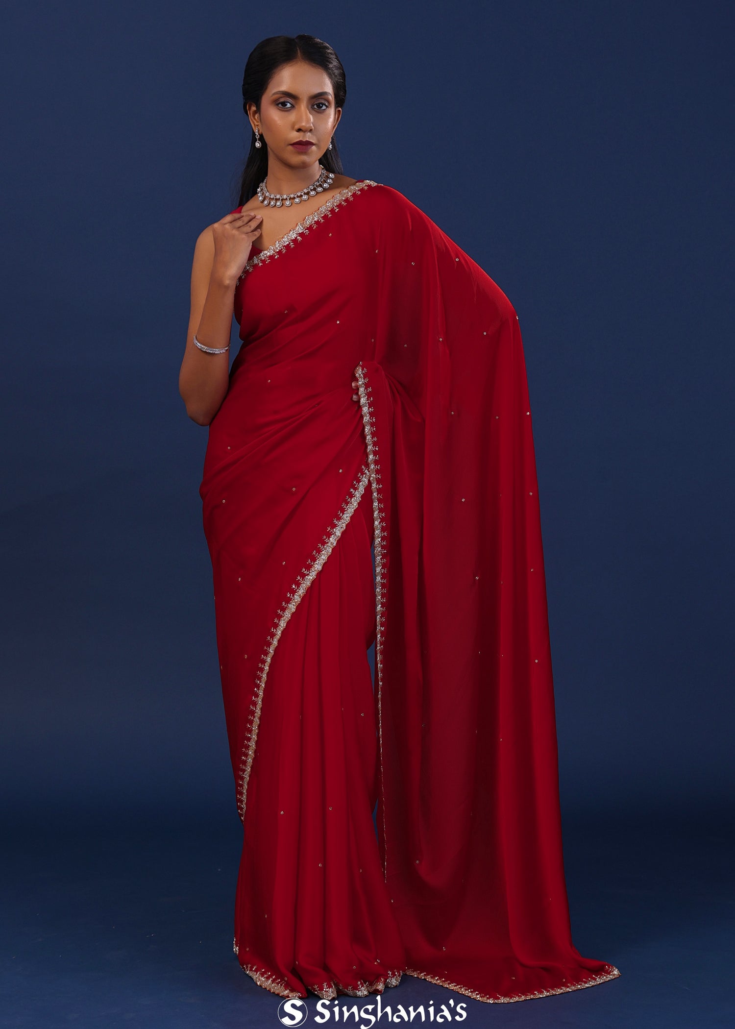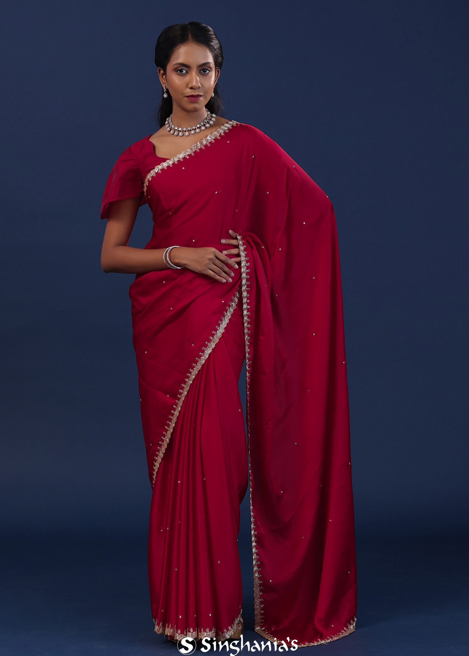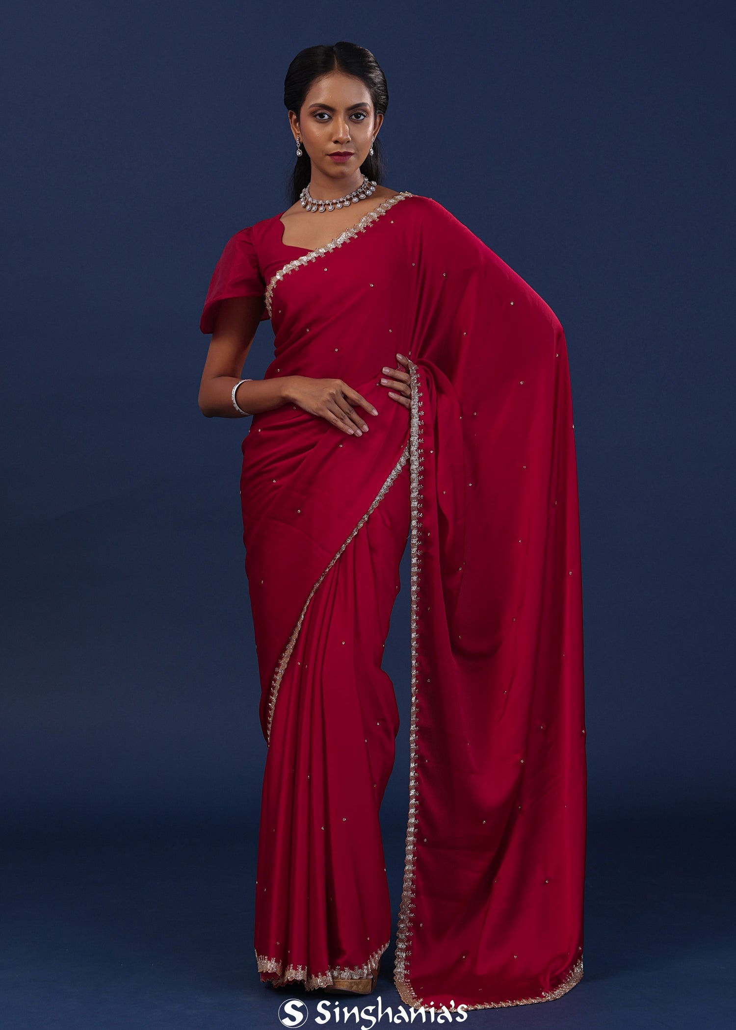 Deep Crimson Red Satin Saree With Cutdana Work