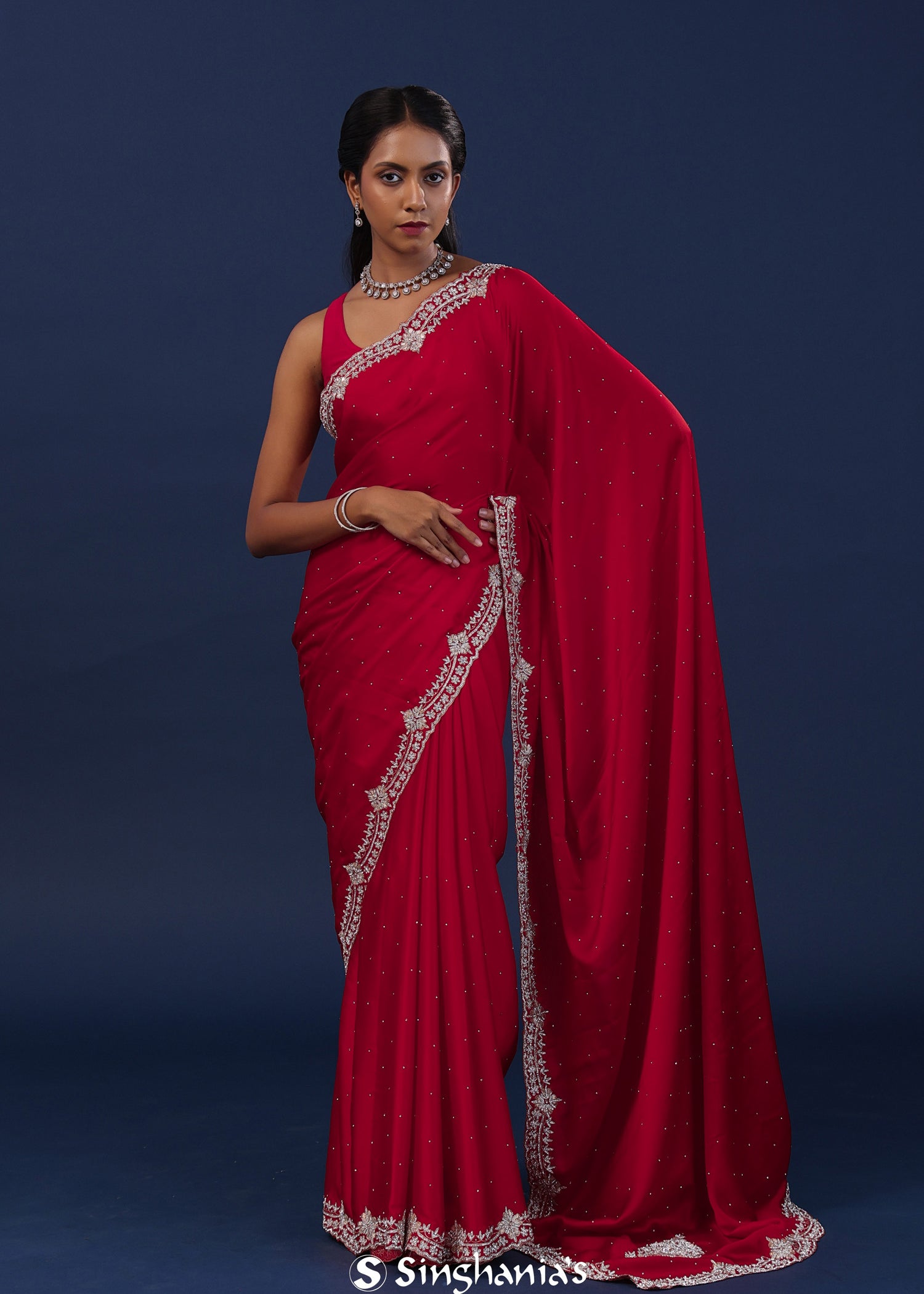 Deep Red Satin Saree With Stone Work