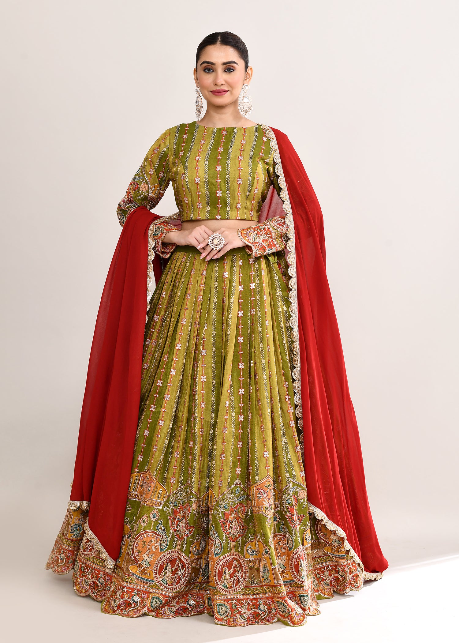 Mehendi Green Satin Crepe Zari Embroidered Lehenga Set