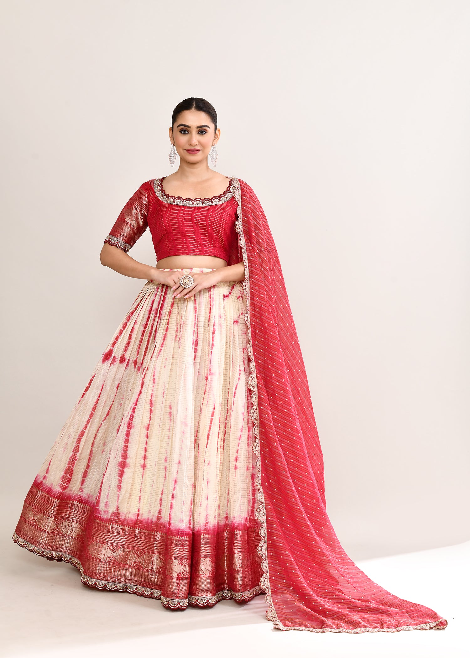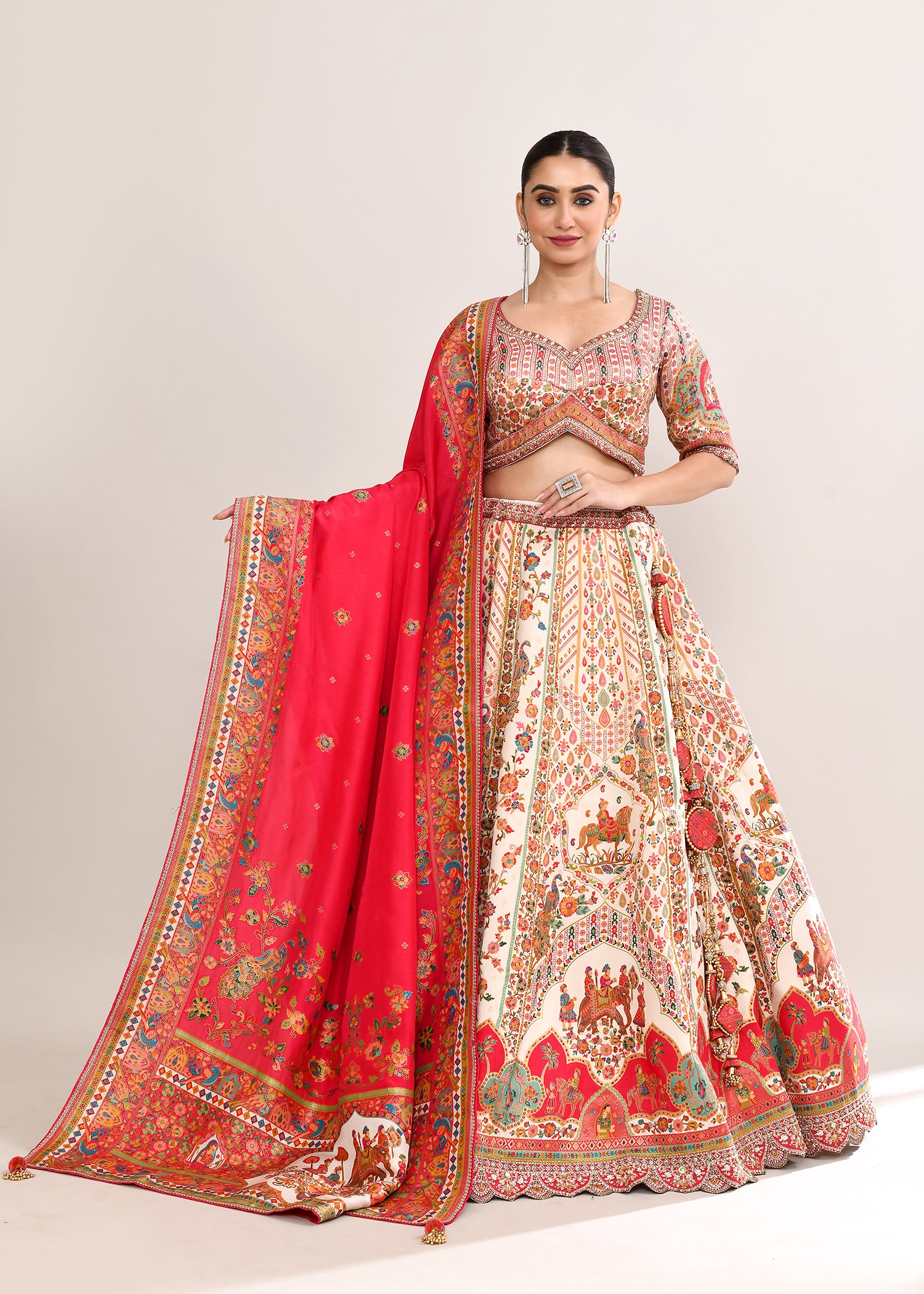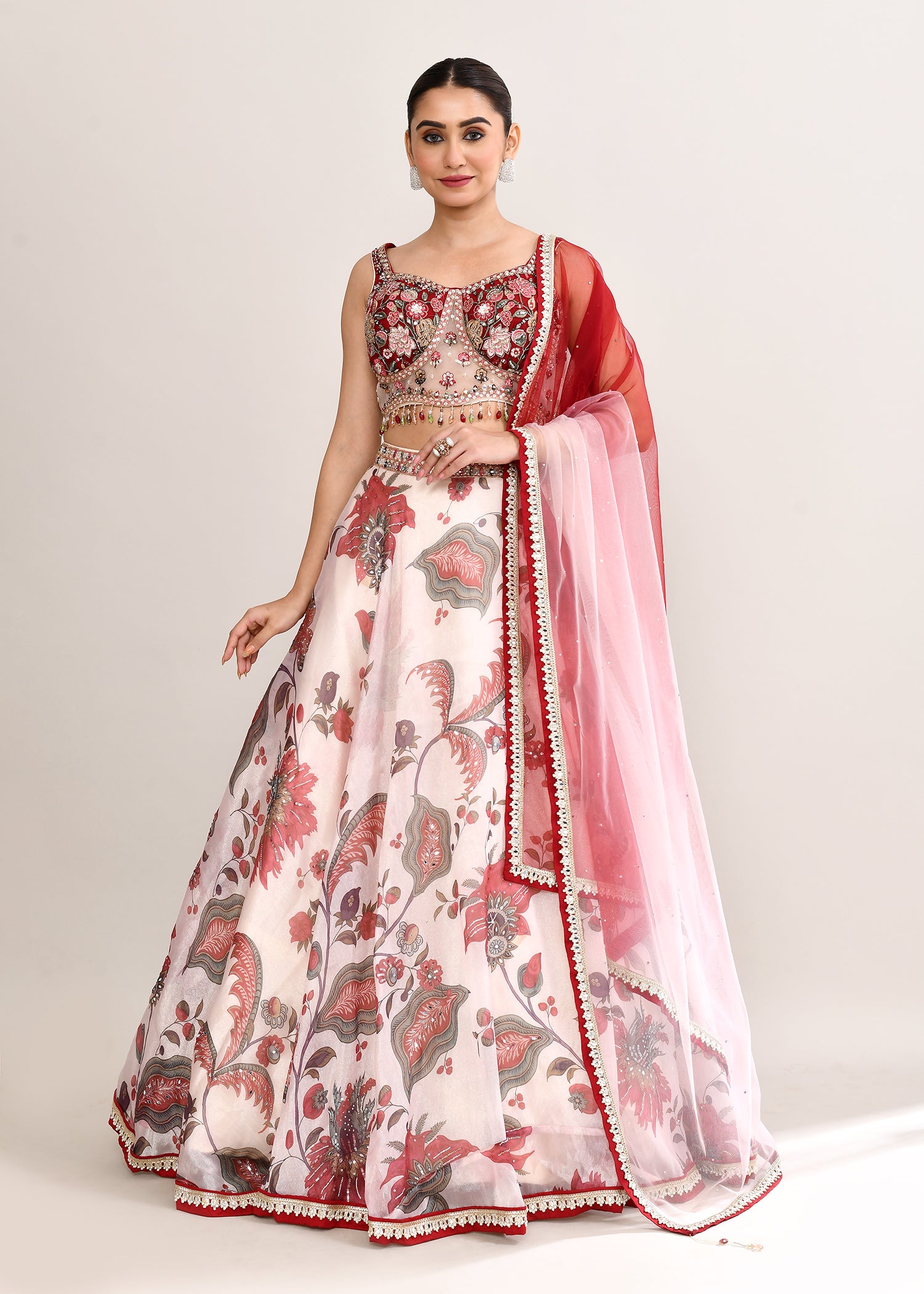Pastel Red Satin Crepe Floral Printed Lehenga Set
