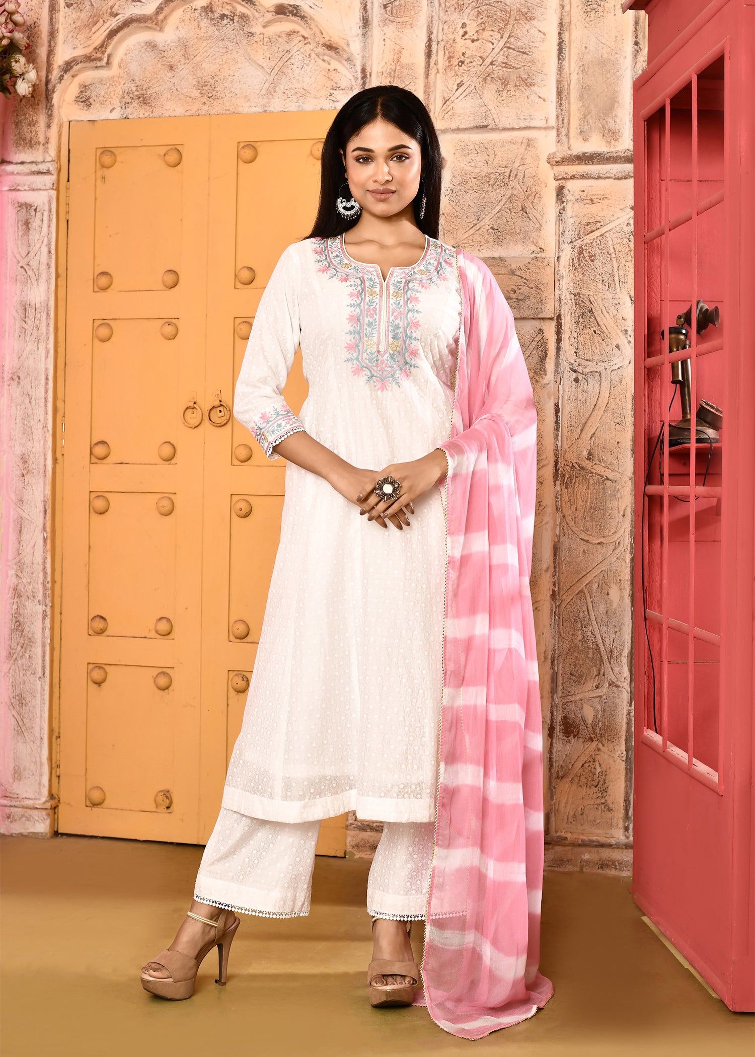Ivory Neck Embroidered A-Line Kurta And Palazzo With Pink Dupatta