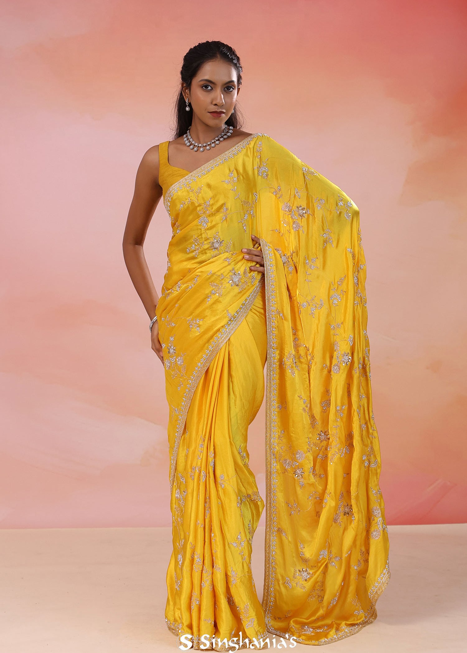 Canary Yellow Modal Satin Saree With Hand Embroidery
