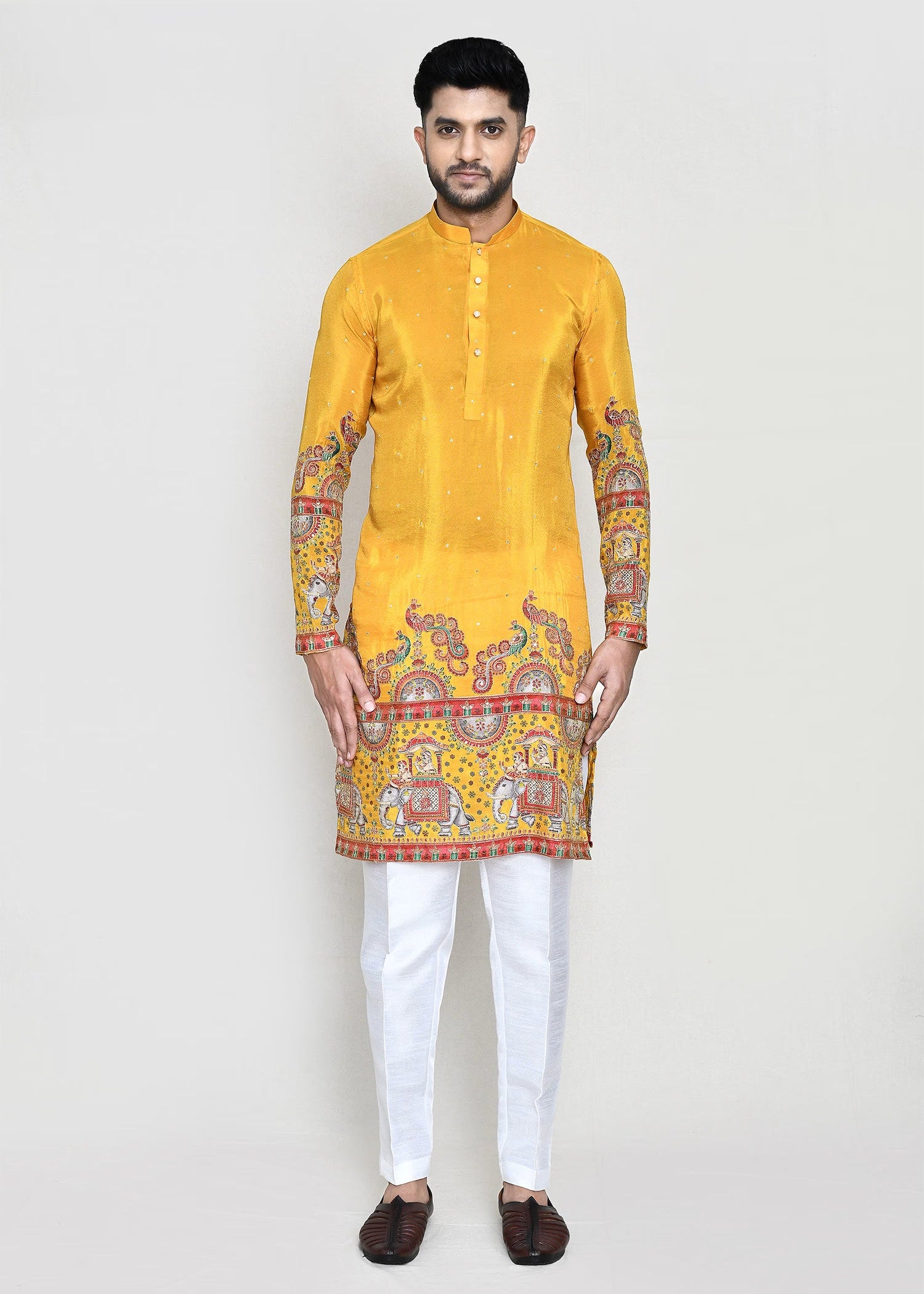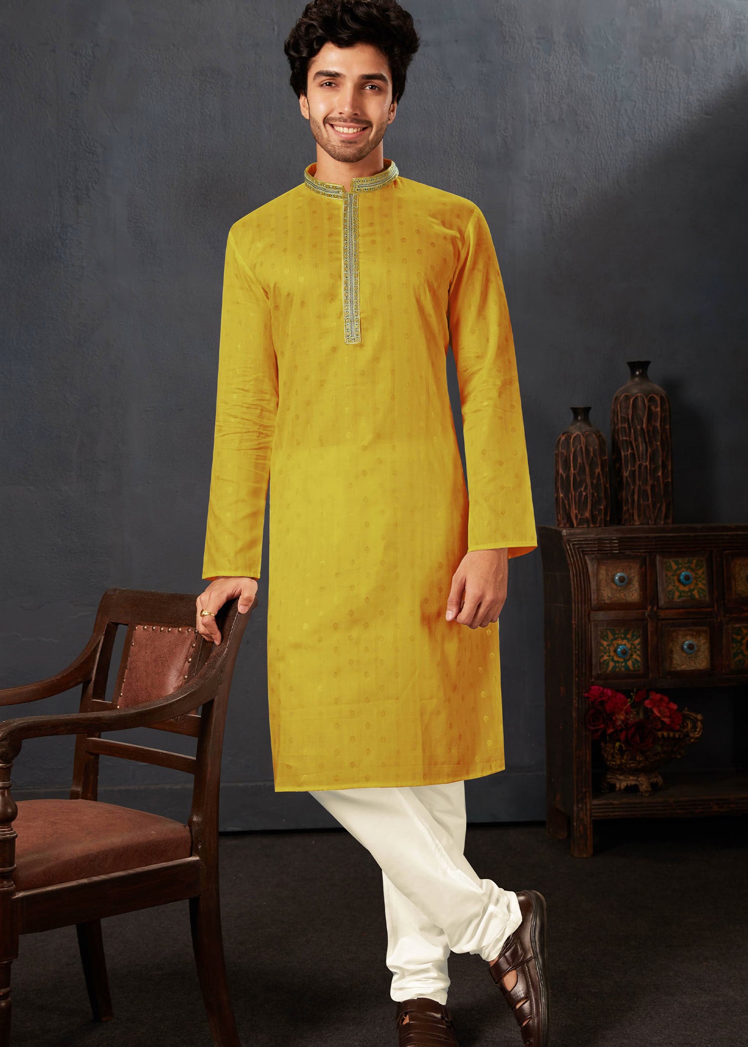 Bright Yellow Jacquard Silk Kurta Set