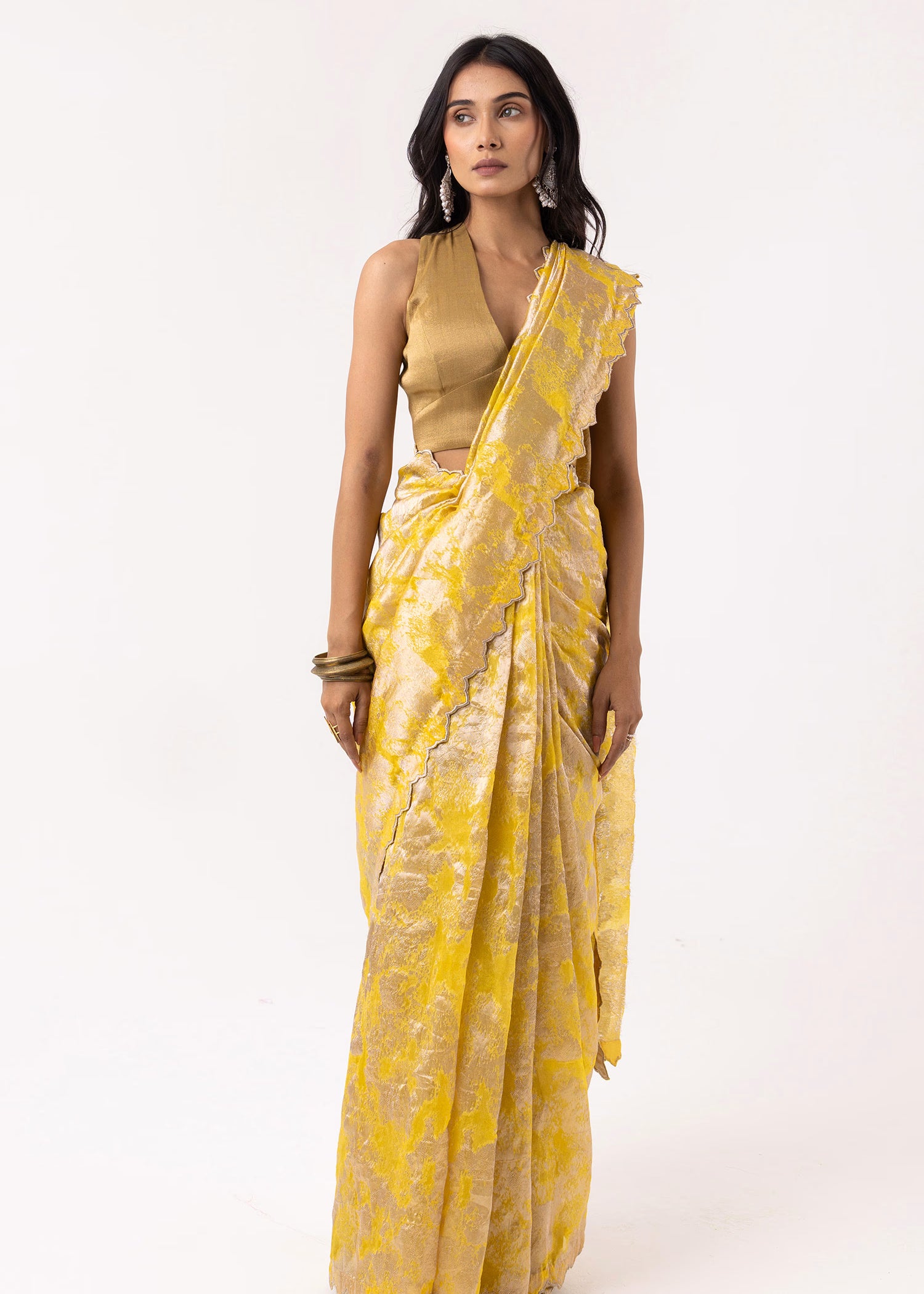 Bright Yellow Viscose Jacquard Saree With Scallop Border