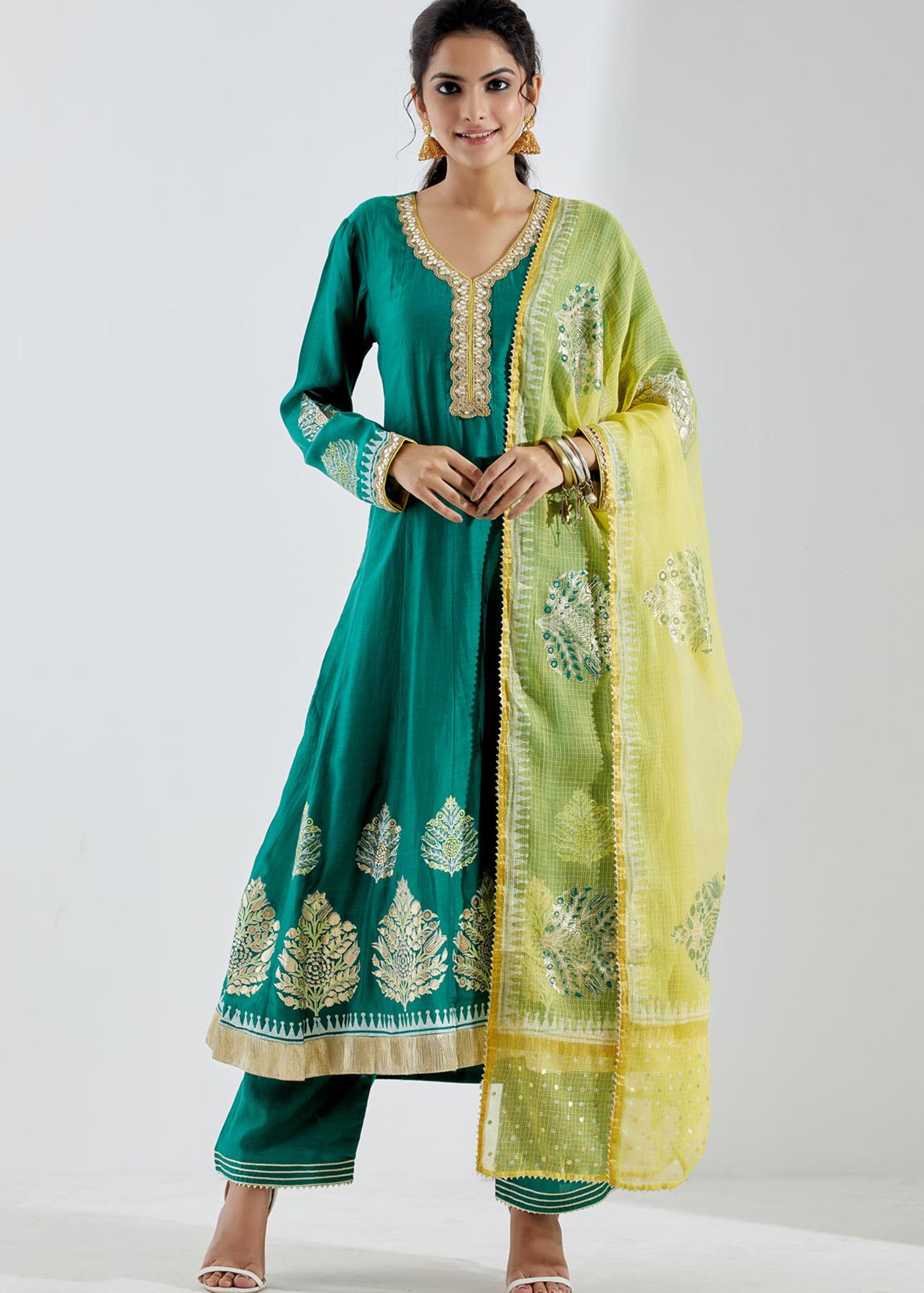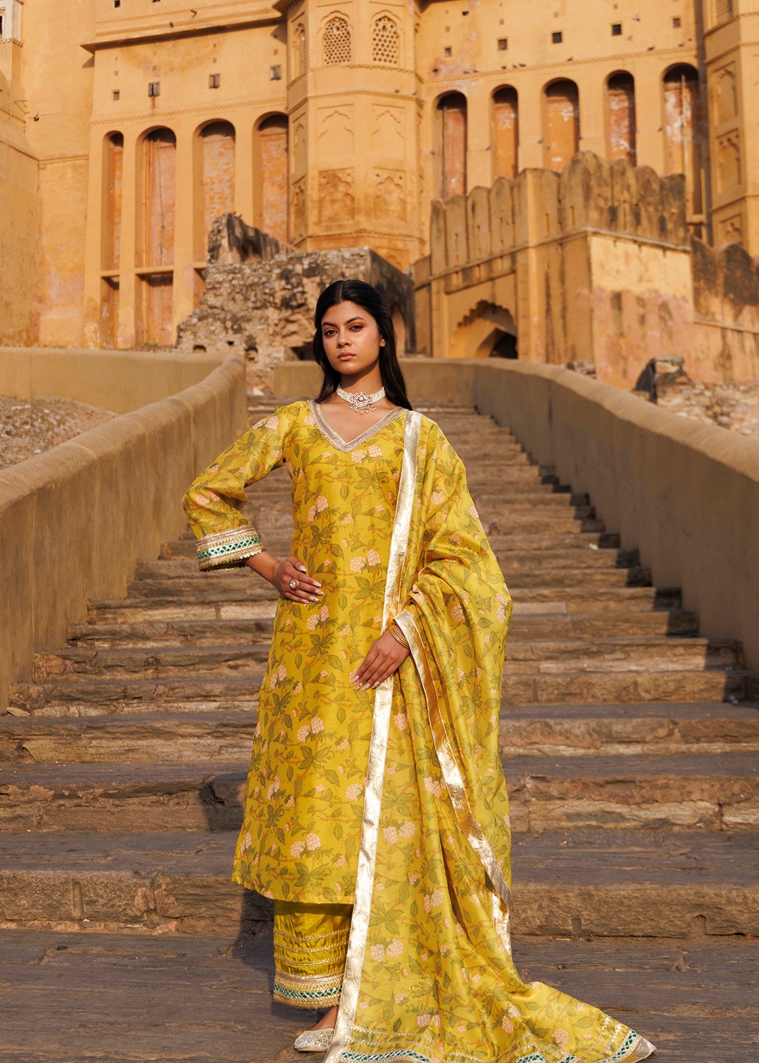 Cyber Yellow Chanderi Kurta Set With Prints And Lace Work