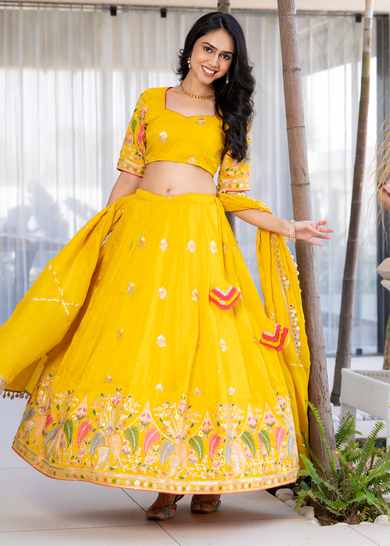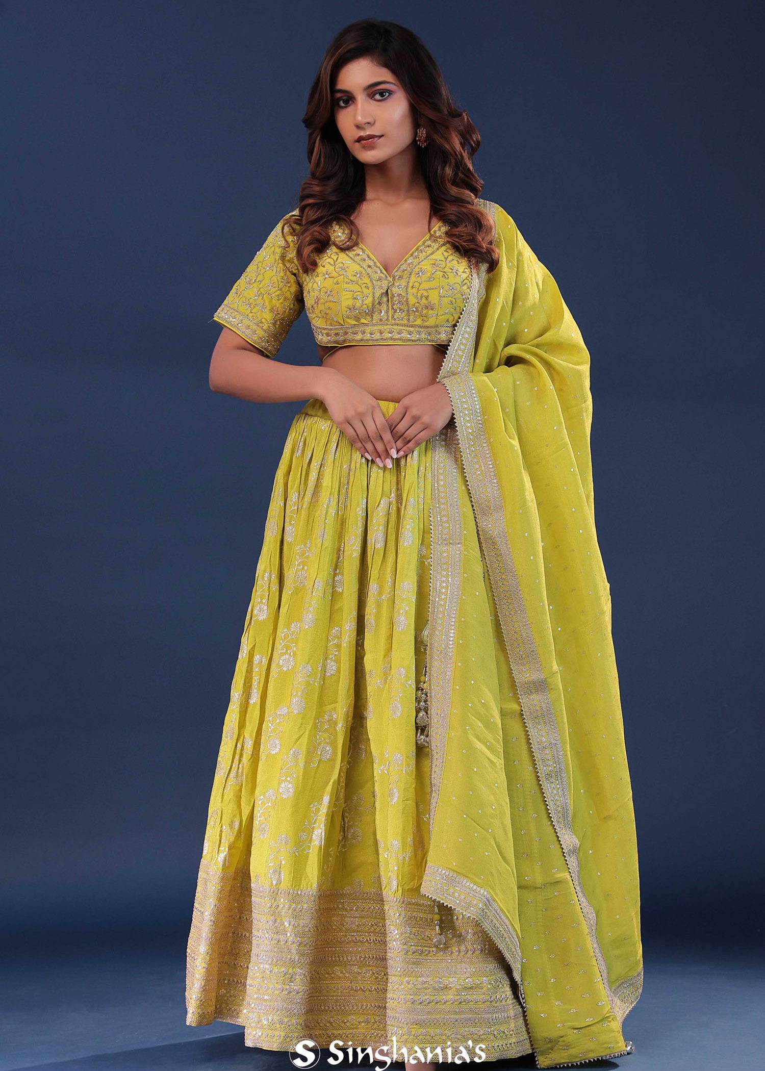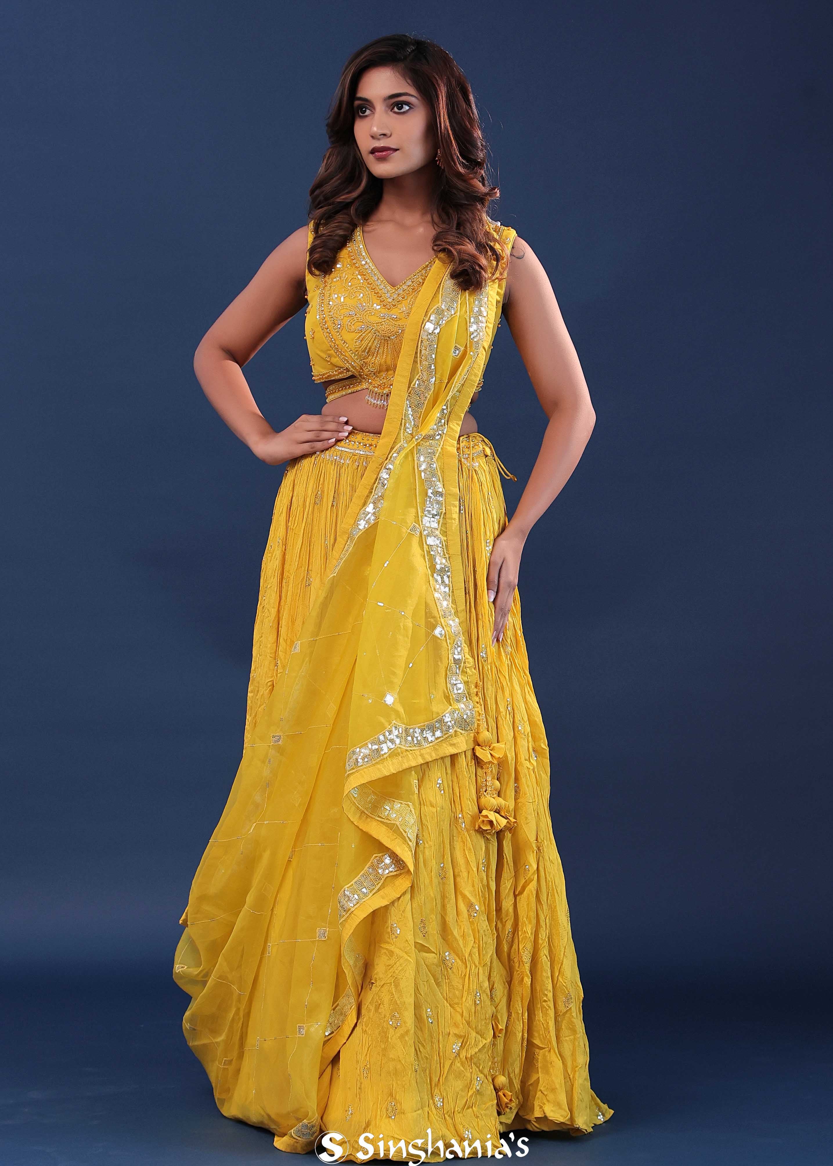 Cyber Yellow Crushed Georgette Lehenga Set With Organza Dupatta