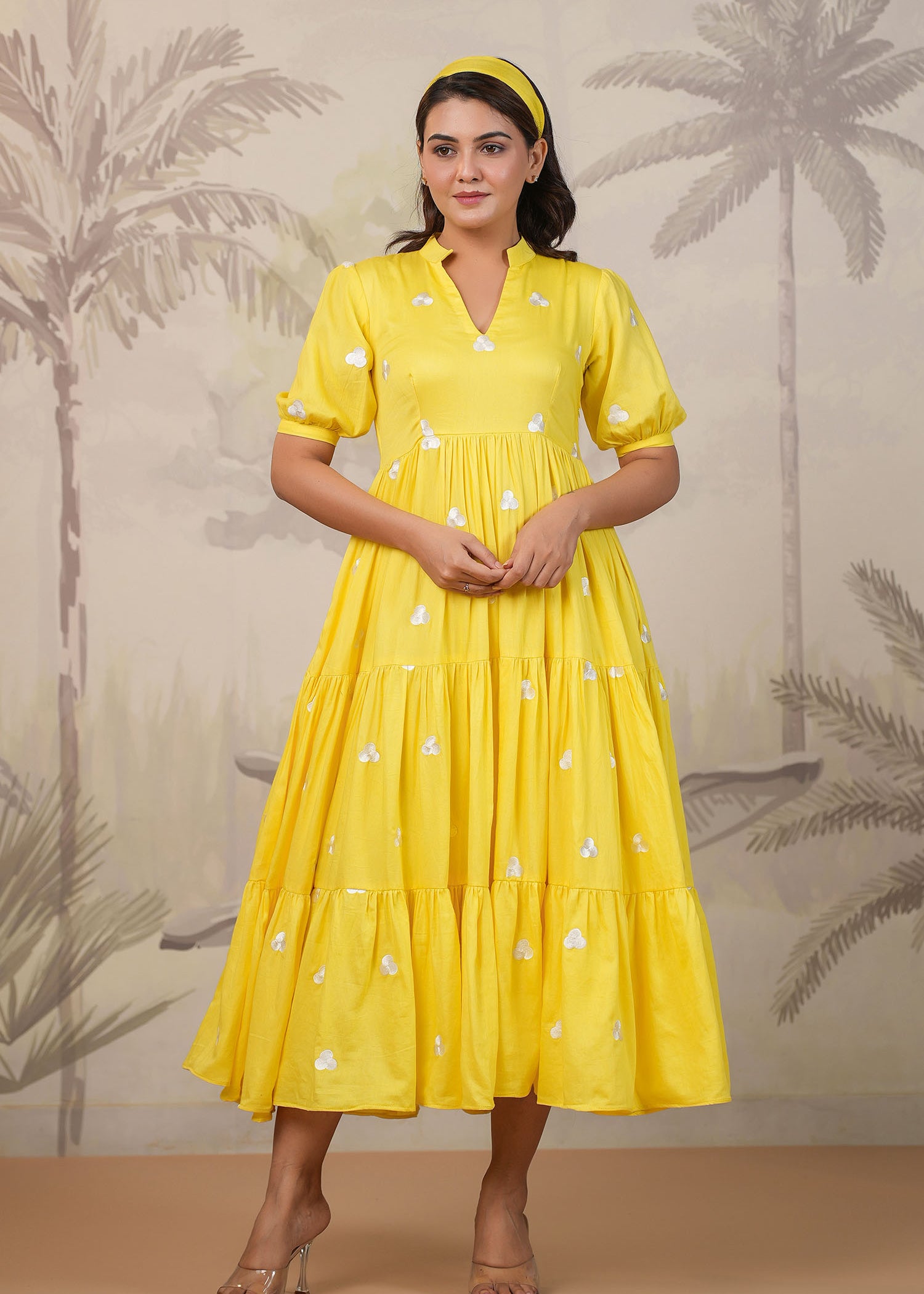 Bright Yellow Organza Embroidery Saree With Scallop Border