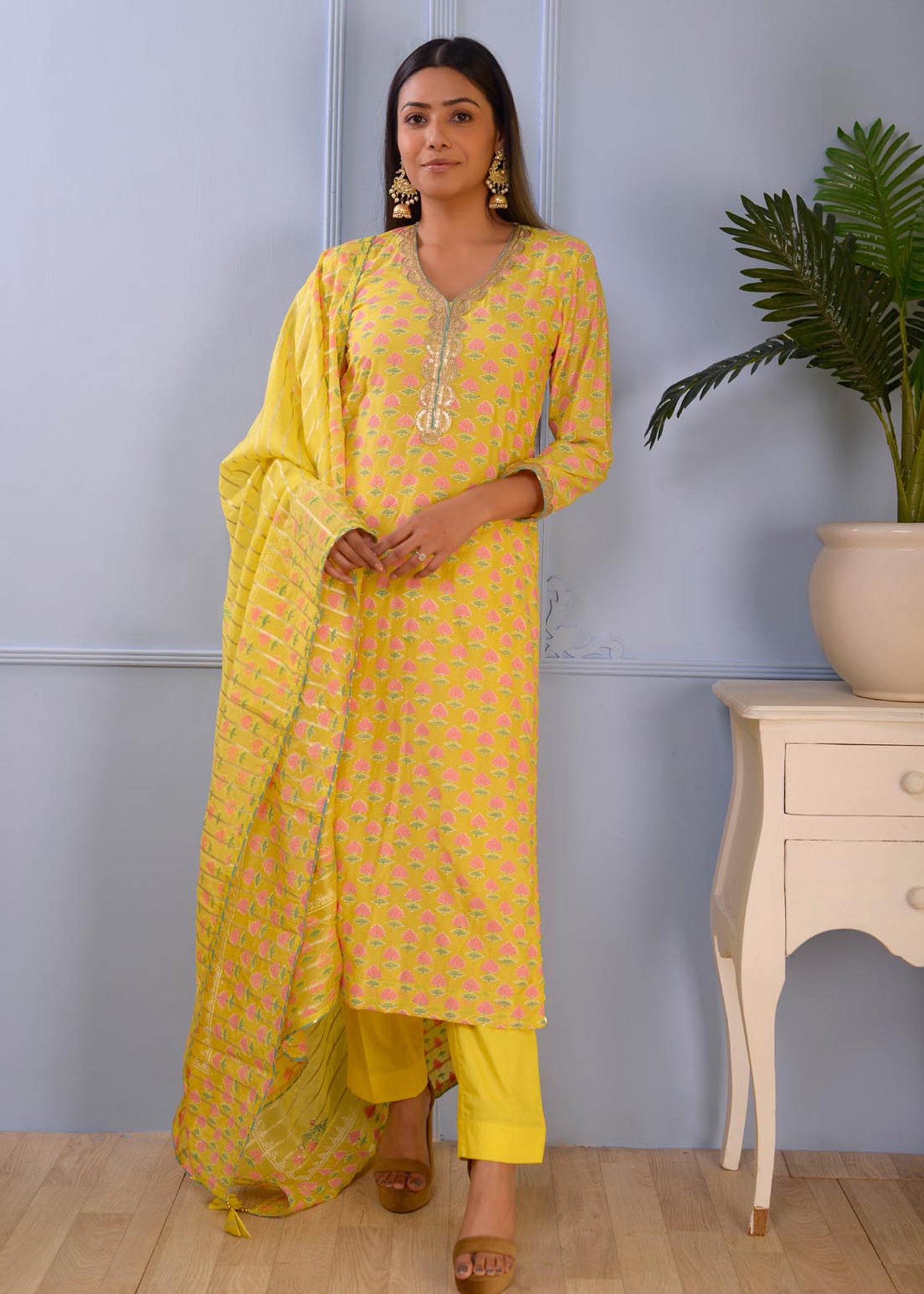 Lemon Yellow Block Printed Cotton Silk Kurta Set