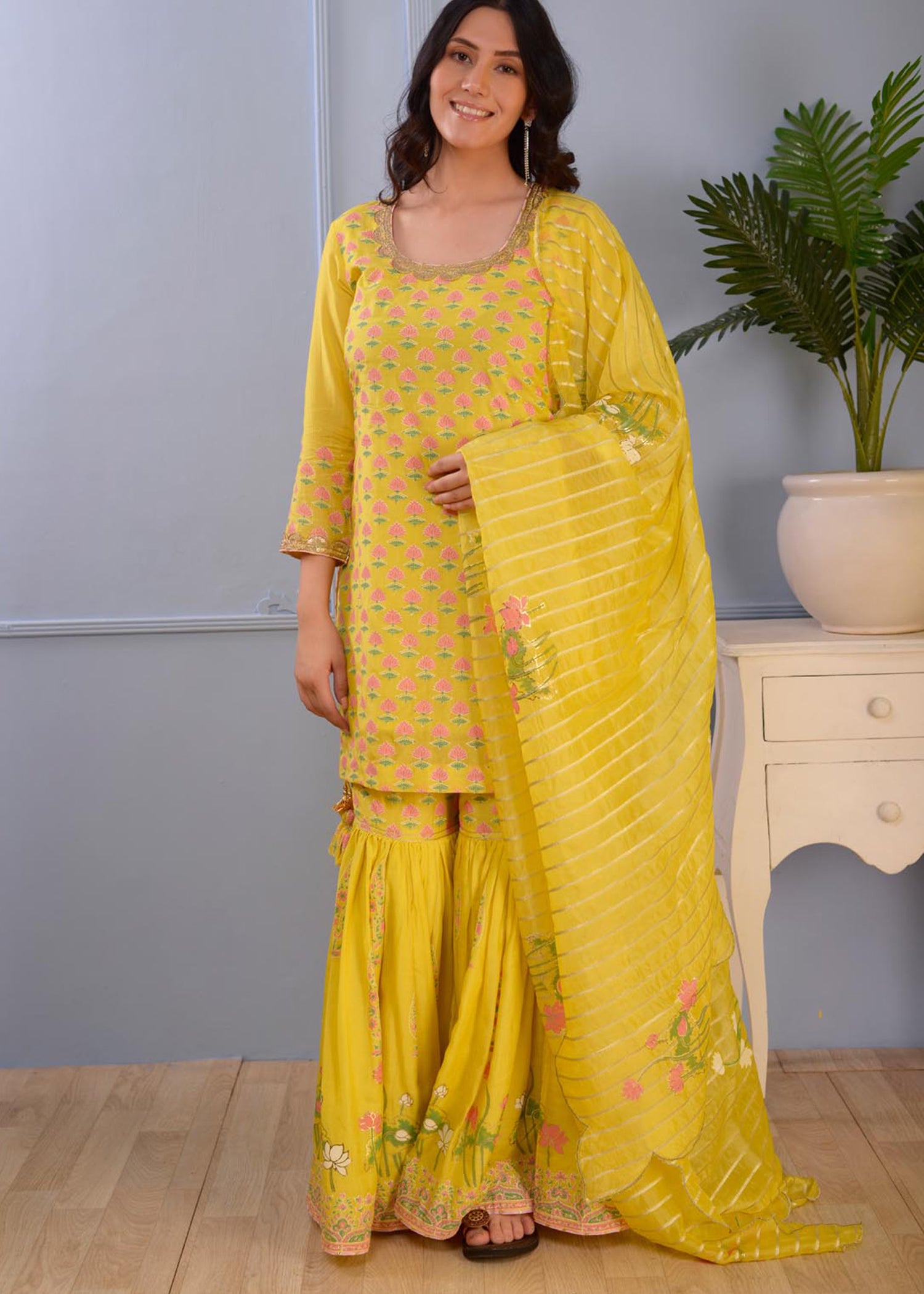 Lemon Yellow Foil Printed Cotton Silk Gharara Set