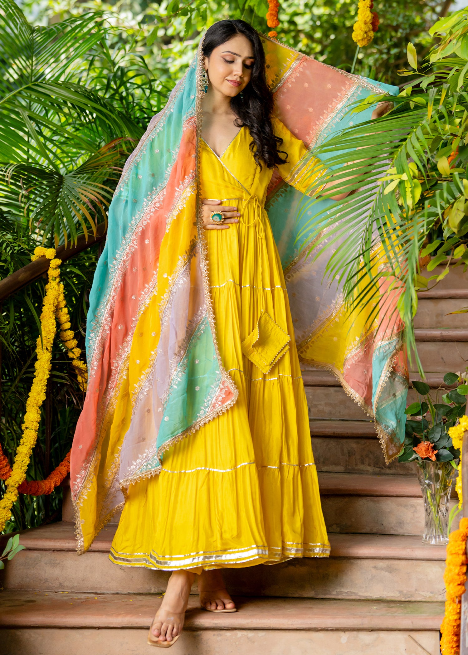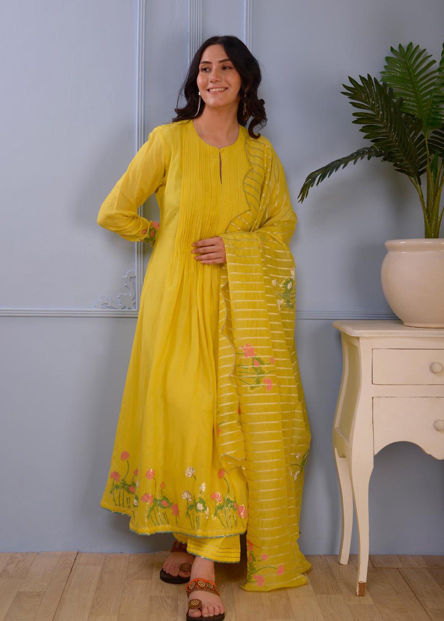 Lemon Yellow Uppada Silk Solid Anarkali Set