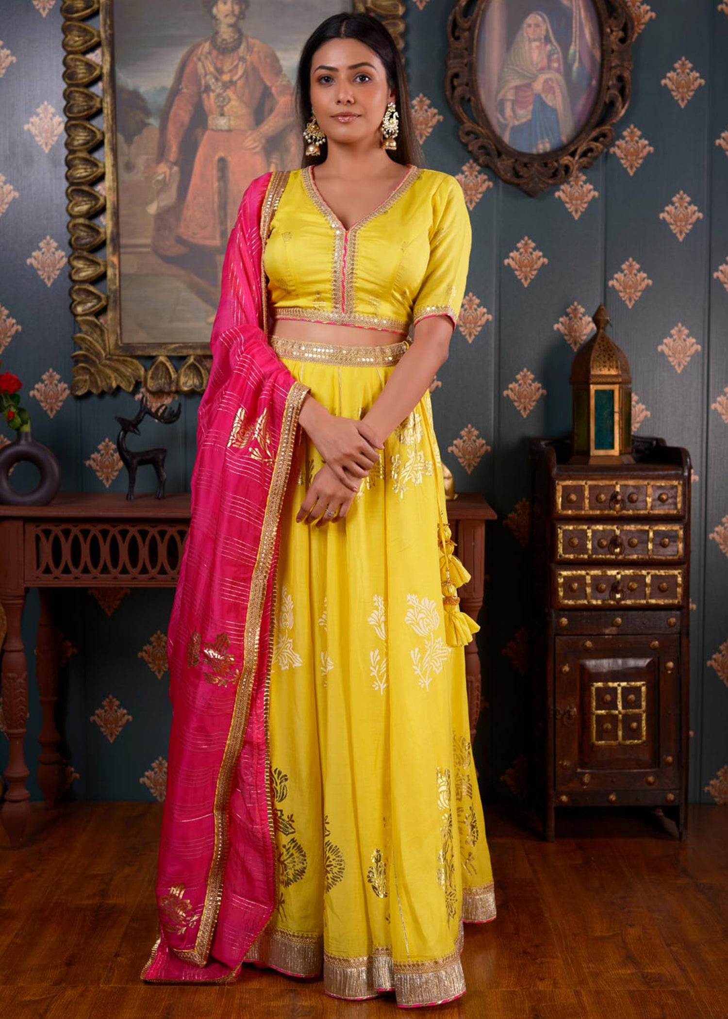 Lemon Yellow Foil Printed Cotton Silk Lehenga Set With Dupatta